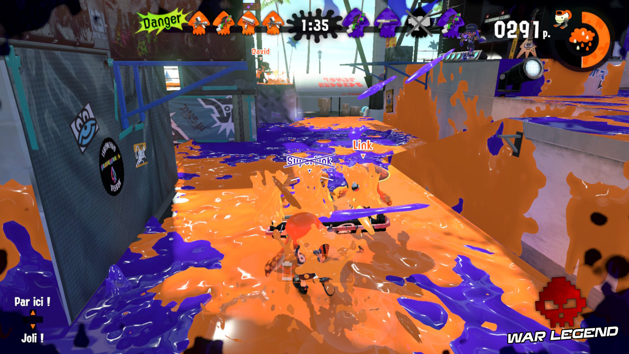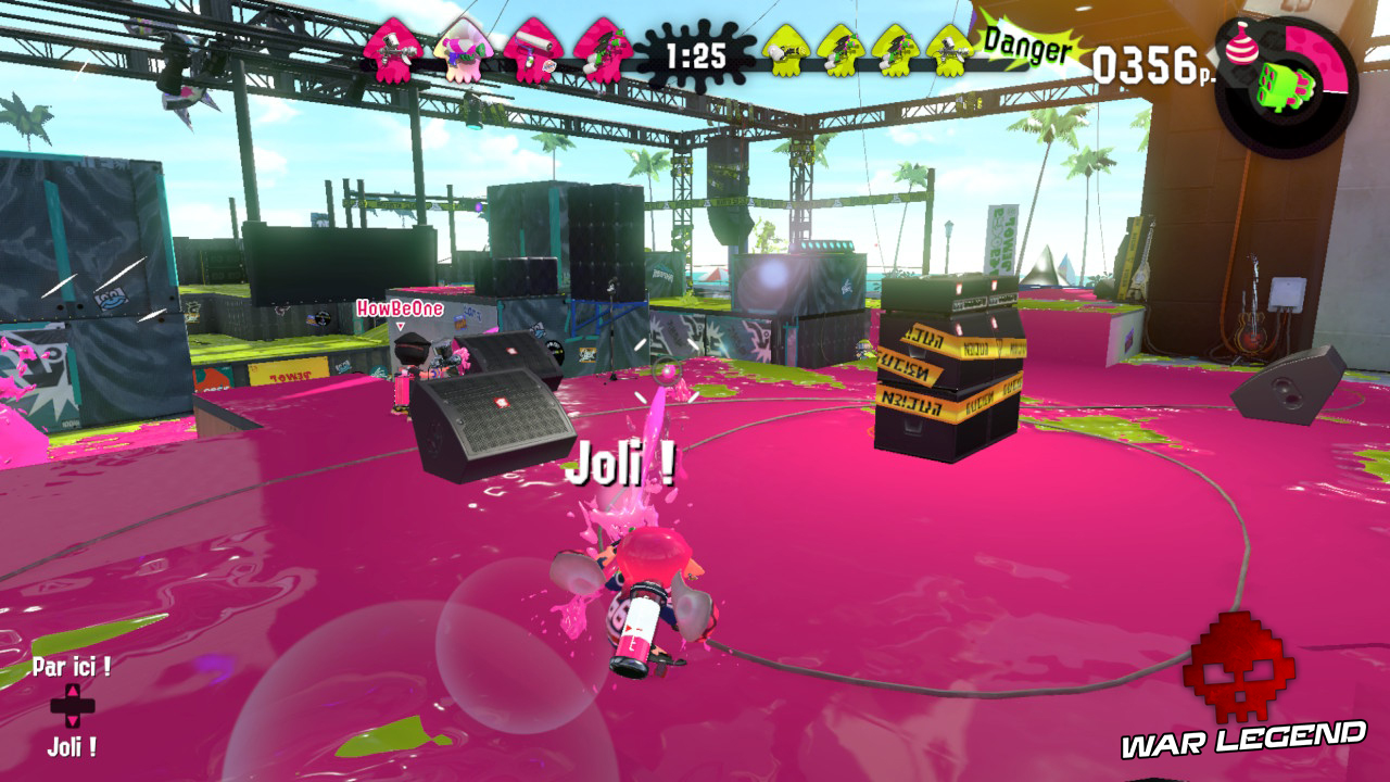 Le cœur du jeu réside bien évidemment dans son multijoueur où la guerre de territoire faire rage. On y retrouve toujours les parties phares qui ont fait le cachet de Splatoon : essayer d’en foutre partout un maximum et accessoirement plus que l’adversaire. Moult outils seront à disposition avec chacun son mode de fonctionnement très personnel. Chaque lanceur d’encre se joue très différemment des autres et offre une variété de jeu très appréciable quand on enchaîne les parties. Si on retrouve tout l’arsenal Wii U, de nouvelles armes originales sont à disposition pour étoffer une quincaillerie déjà conséquente. On y trouve par exemple le double lanceur avec une cadence de tir élevée qui permet d’exécuter des roulades ou encore le parapluie à jet d’encre qui permet de se protéger de tirs ennemis avec un bon sens du timing. Les vielles armes ne sont pas en reste puisqu’elles ont été rééquilibrées et pour certaines modernisées, comme le sniper qui permet à présent de garder sa charge un bref instant quand le joueur se cache dans son encre. Parfait pour les embuscades de fourbes. Le plus gros changement réside surtout dans les armes ultimes qui ont toutes été refaites, beaucoup moins abusées lors de leur utilisation. Elles sont toujours aussi efficaces mais demanderont d’être utilisées à bon escient car facilement contrables. Au revoir le méga calamar, je ne te regretterai pas.