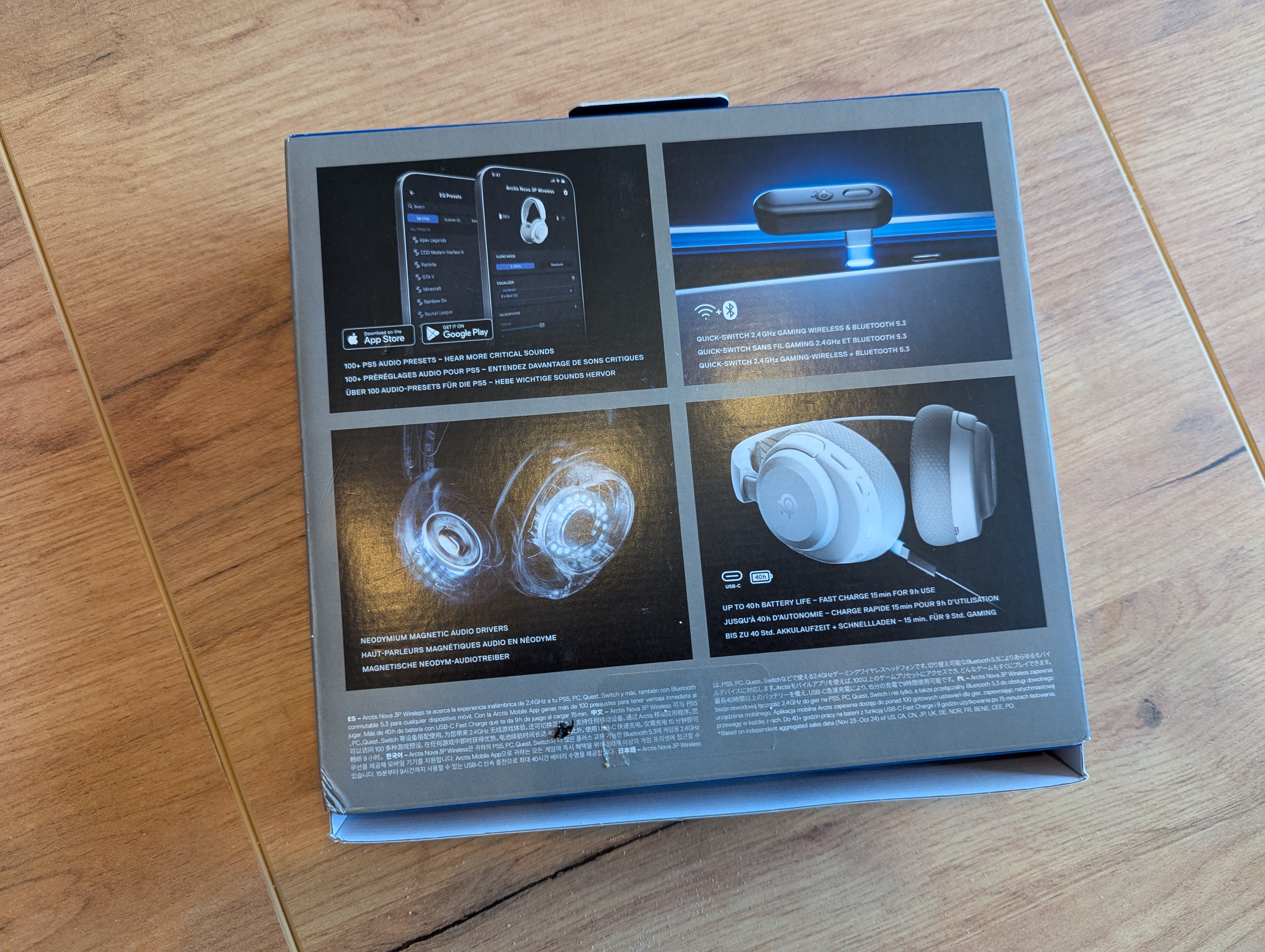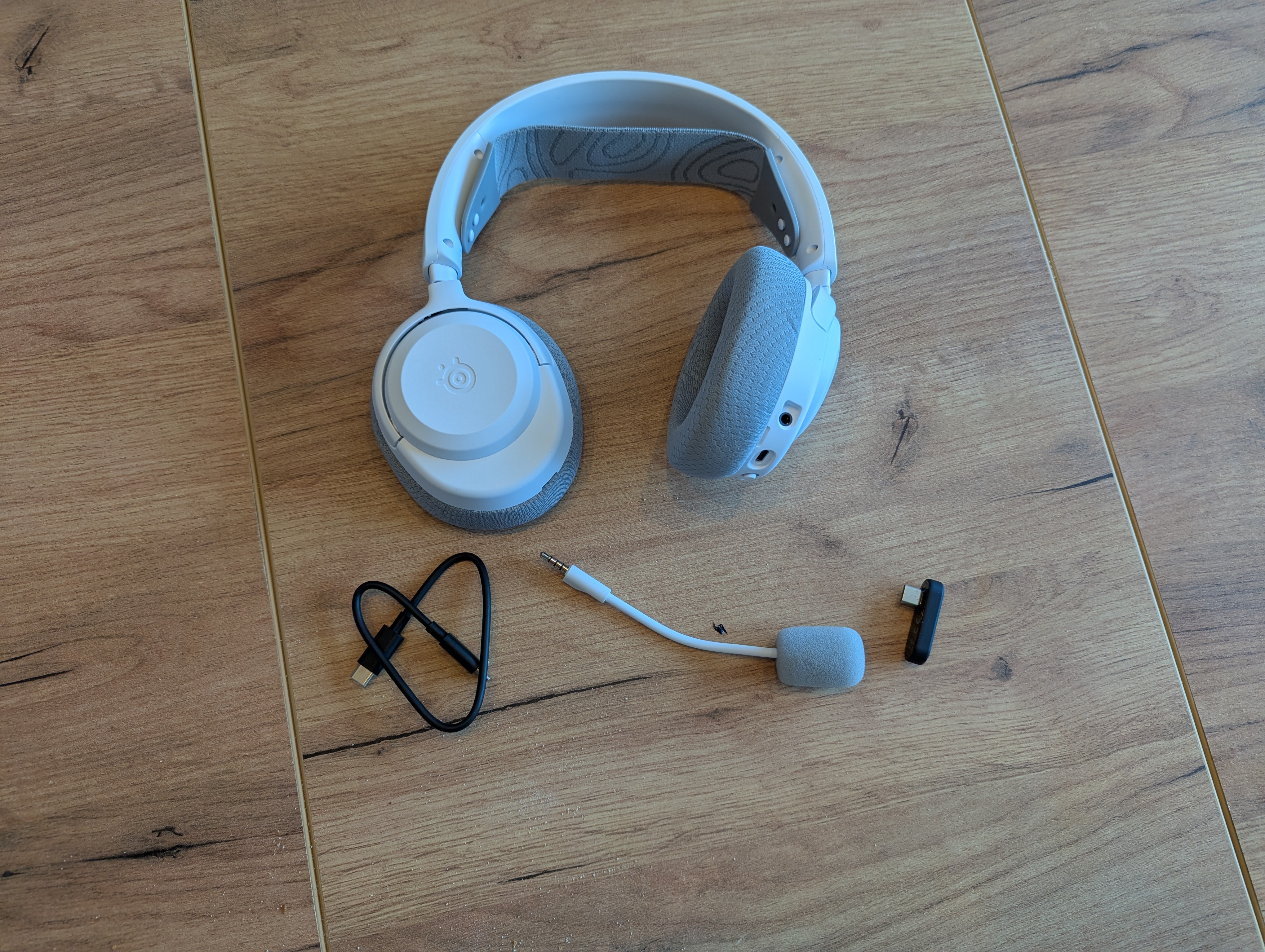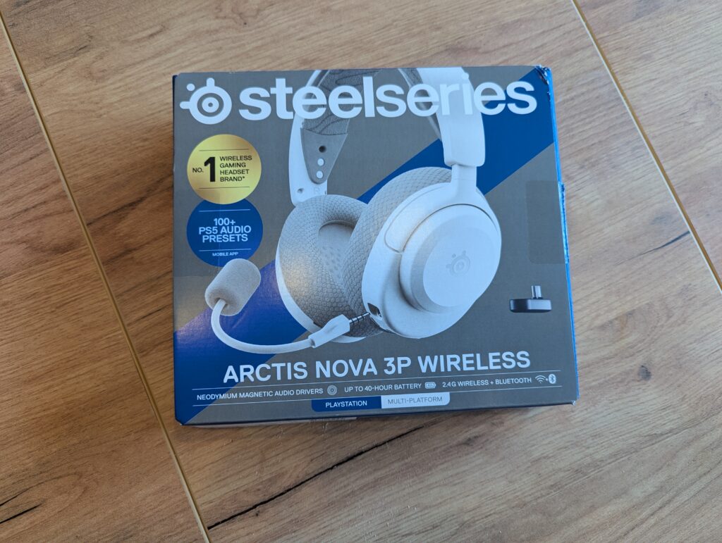 Dans la boîte, SteelSeries va droit au but. On retrouve le casque, son microphone amovible, le dongle USB-C pour la connexion 2,4 GHz, un câble de charge USB-C vers USB-A et un câble adaptateur. Le Nova 3 Wireless est un casque circum-aural fermé qui affiche des caractéristiques techniques solides pour sa gamme. Il embarque des haut-parleurs de 40 mm et promet une autonomie conséquente : jusqu’à 30 heures en connexion 2,4 GHz et près de 40 heures en Bluetooth.