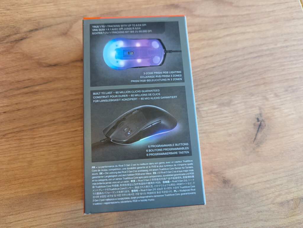 La SteelSeries Rival 3 Gen 2 est livrée dans un emballage sobre et efficace, qui va droit au but. À l’intérieur, on retrouve la souris et sa documentation. Pas de fioritures, on est dans le « plug-and-play ».