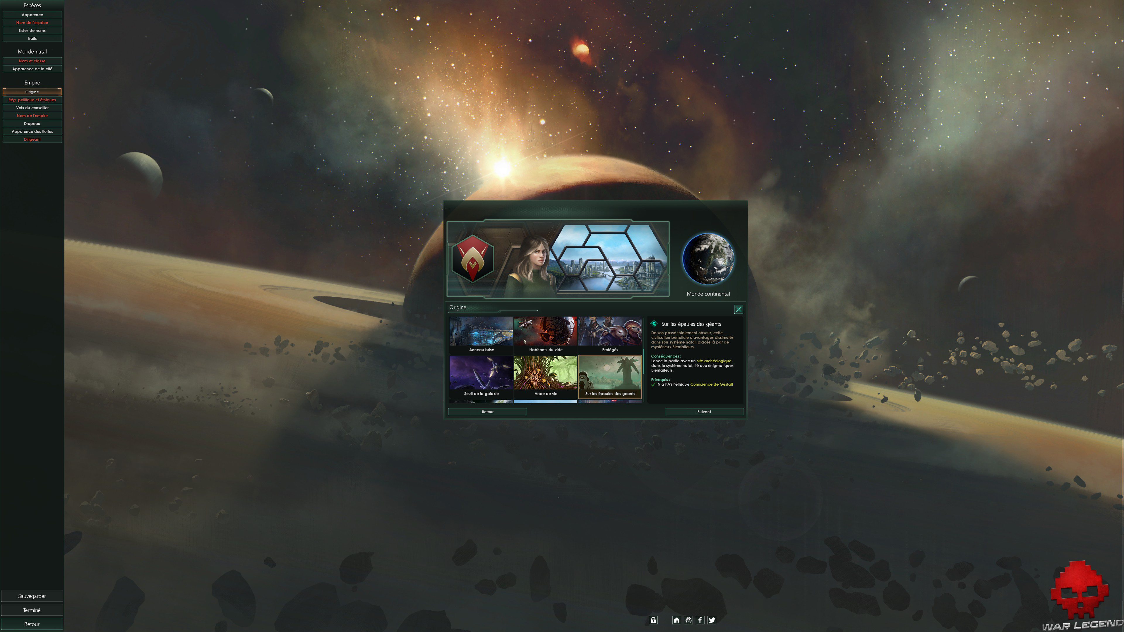 Viennent s’ajouter à tout cela les origines. Quelle fantastique opportunité que celle de déterminer les conditions de démarrage de notre peuple ! Chaque extension à droit à ses origines, y compris Federations. On aura ainsi la possibilité de démarrer la partie sur un anneau-monde partiellement détruit, avec la possibilité de restaurer les fragments délabrés. Certaines histoires ont des conséquences très concrètes tout au long de la partie, jusque dans ses derniers instants. D’autres en revanche apparaissent un peu plus « flemmard », comme celle qui verra votre planète d’origine exploser après 35 à 45 ans – vous n’avez aucune garantie qu’un monde habitable se trouve à proximité. Cela aurait pu être intéressant si cette origine avait des répercussions autres qu’économiques (vous allez bien douiller) et que l’histoire se poursuivait. Au lieu de cela, vous serez juste un couillon avec une planète en moins.