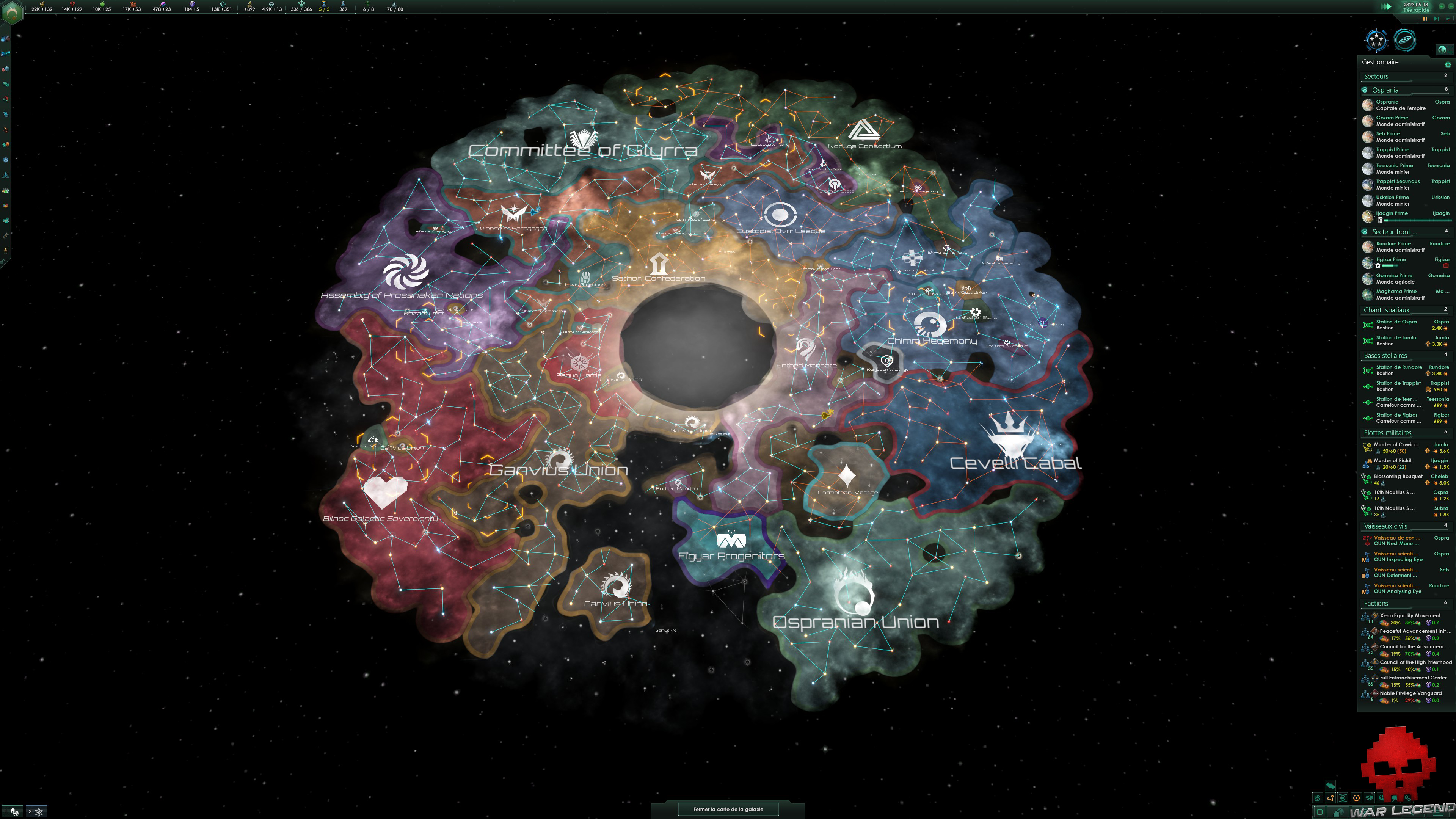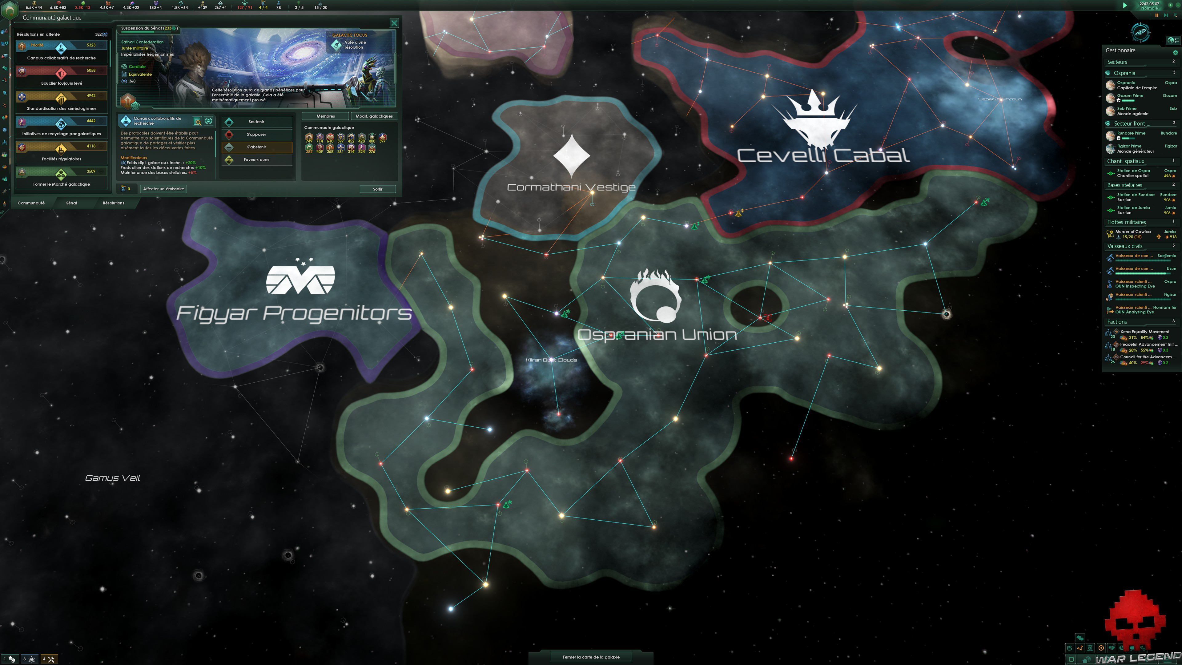 Tout cela a de grosses conséquences, car les décisions politiques de la communauté galactique vont affecter la production de ressources, les avancées scientifiques, mais aussi la politique intérieure de chaque empire. Peut-être êtes-vous un grand fan de la provolution, mais que la communauté considère que c’est contre-nature-han. « M’en fous, je fais ce que je veux ». Oui certes, mais du coup votre voisin peut trouver ça injuste et proposer au vote des sanctions pour les contrevenants – et ça peut faire très mal. Oh, et pour ceux qui souhaitent demeurer en dehors de la communauté – je ne vous ai pas oubliés -, il est tout-à-fait envisageable de promulguer une loi rendant illégaux les empires extérieurs à la communauté. Bon courage dans la guerre totale qui vous attend.