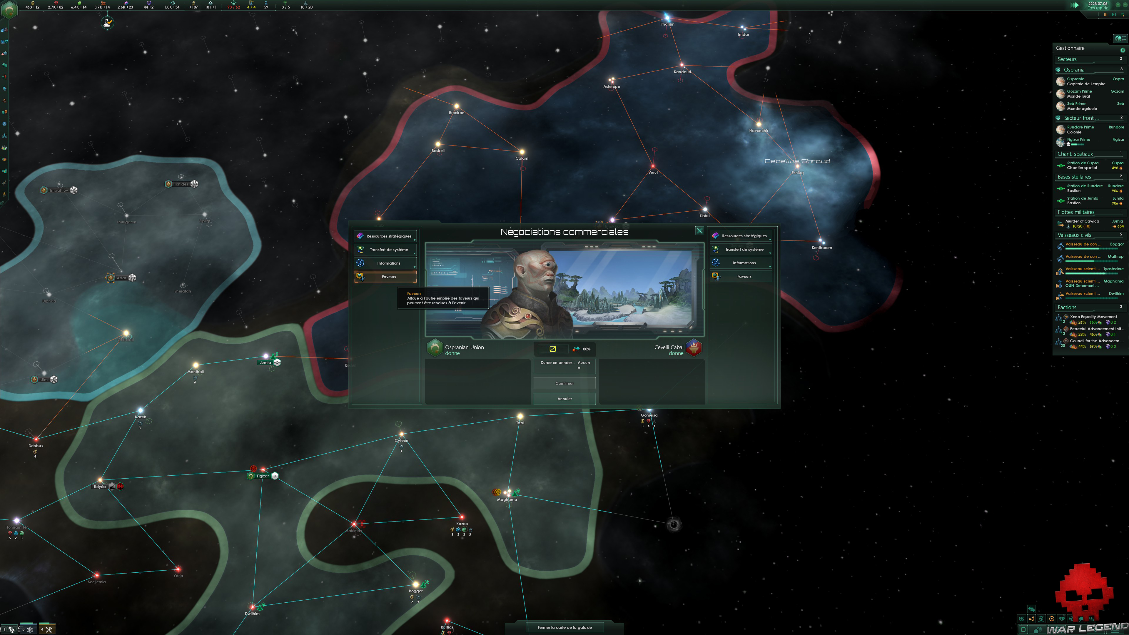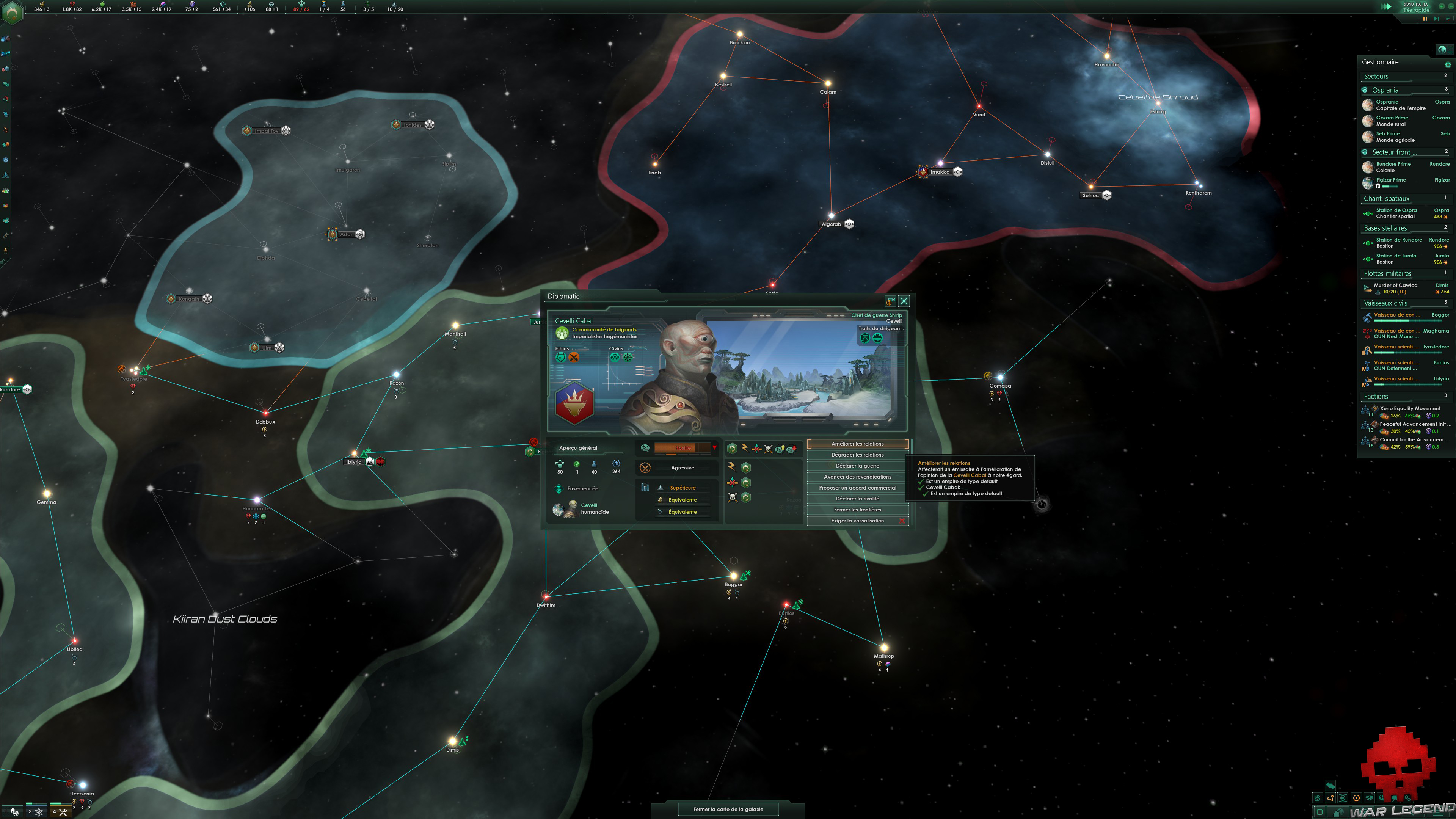 Pour compléter le tableau, sachez qu’il est possible d’envoyer des émissaires à travers la galaxie pour améliorer vos relations ou bien les dégrader, ou bien directement auprès de la communauté ou de votre fédération pour arrondir les angles. Ils ajoutent un bonus ou un malus mensuel de relation.