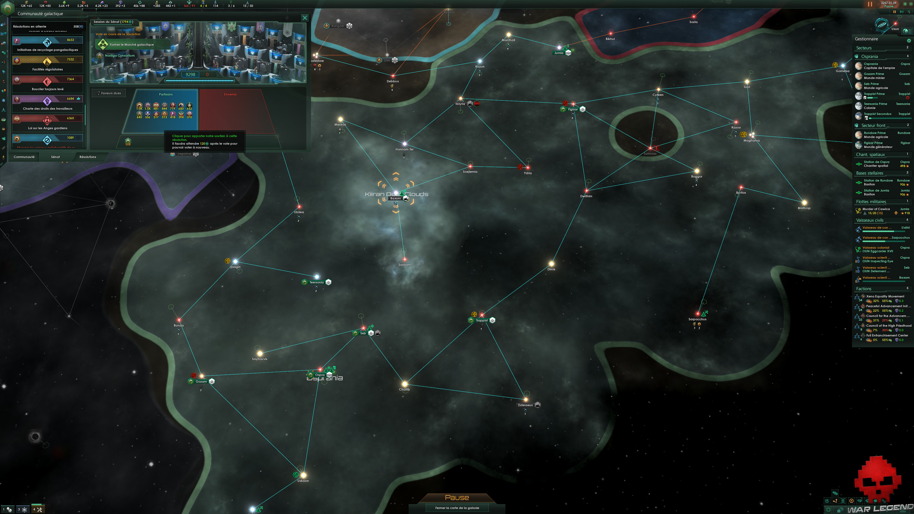 Mais le véritable plat de résistance de cette extension, c’est la communauté galactique. Après un certain temps, assez de factions se seront rencontrées, et une organisation globale sera créée. Vous aurez l’opportunité de la rejoindre ou bien de vivre en marge. Je vous conseille vivement de la rejoindre, vous verrez pourquoi un peu plus bas. Dans cette communauté, chacun a un poids diplomatique, fonction de sa puissance de flotte, de sa population, de ses avancées scientifiques, etc. Ce poids diplomatique est utilisé dans la promulgation de lois qui seront effectives pour la totalité des membres.