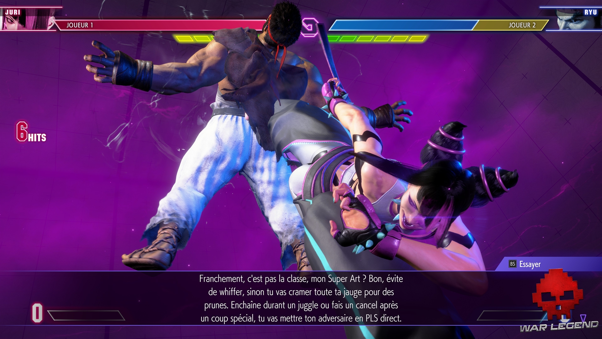 Mais… c’est avec ses différents modes dédiés à l’apprentissage en profondeur du jeu que Street Fighter 6 a bien failli me faire tourner de l’œil. Outre les éternels défis pour apprendre les combos de bases – les fameux B’n’B – et des idées pour des enchaînements plus avancés, chaque personnage profite de guides assez poussés qui démontrent l’utilité des principaux coups normaux, coups spéciaux, mais qui portent également sur des tactiques et stratégies plus globales en fonction des personnages.