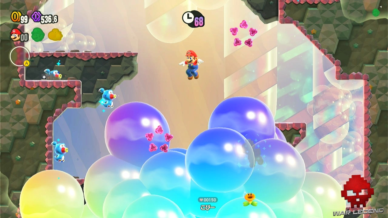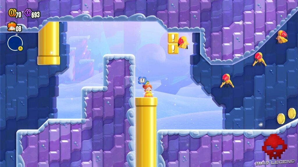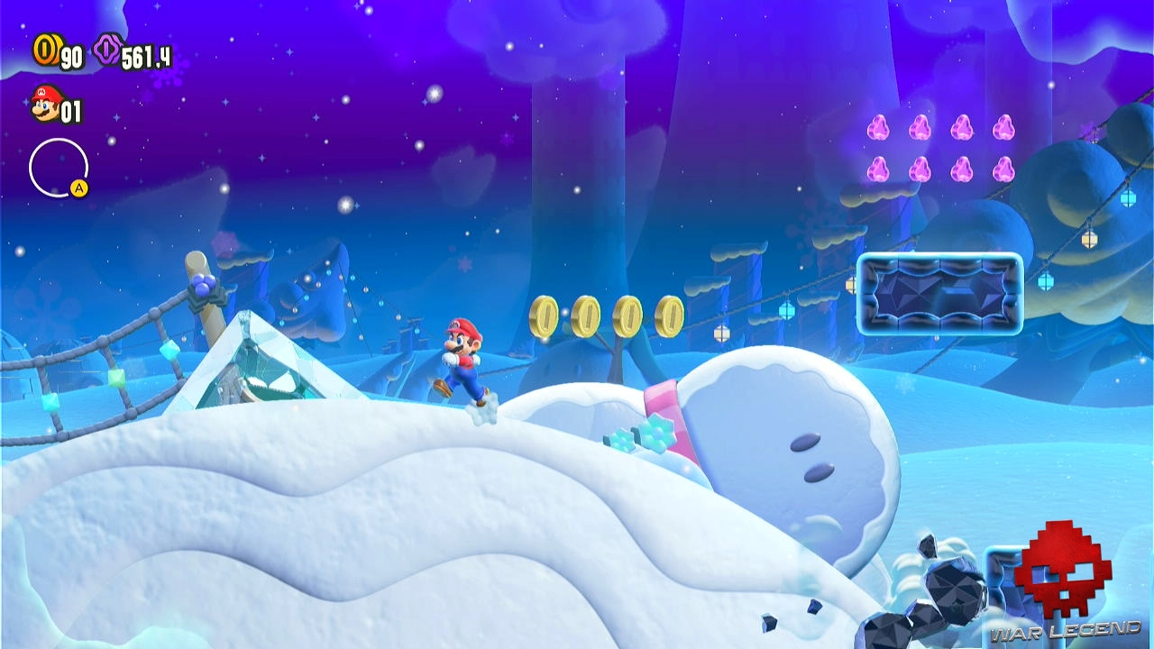 Le personnage du joueur peut se mettre à faire de la chute libre, se transformer en élément du décor et agir comme tel, s’allonger afin de faire la moitié de l’écran, se faire attaquer par un troupeau de bisons célestes, chevaucher un tuyau qui se déplace comme une chenille, tenir sur une énorme boule de neige qui emporte le décor à la manière d’un Katamari Damacy, se retrouver à marcher sur les murs changeant la perspective scrolling pour du top down, etc. Et même… se transformer en goomba, résultant à un sacré renversement de la situation.