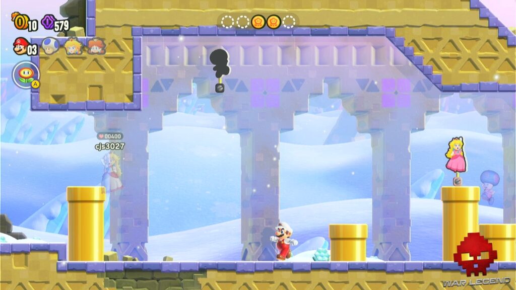 Tâtonnant le terrain où il le peut, Super Mario Bros. Wonder propose même un mode en ligne plutôt intéressant, donnant l’impression de coopérer avec des joueurs distants, mais sans l’entrave du cadre comme dans une session en multijoueur local (à moins d’inviter spécifiquement un ami).