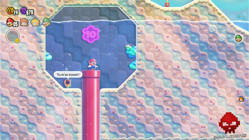 Un joueur de passage peut vous ranimer en cas de mort imminente, tandis qu’un système de panneaux à placer – et collectionner – permet de pointer des points précis sur le parcours, comme pour partager l’emplacement d’un secret de façon asynchrone. Ouais, c’est bizarre à dire, mais je crois que Mario Wonder s’est inspiré de Dark Souls. C’est mignon, peu invasif, au potentiel de sauver une partie, et surtout totalement optionnel.