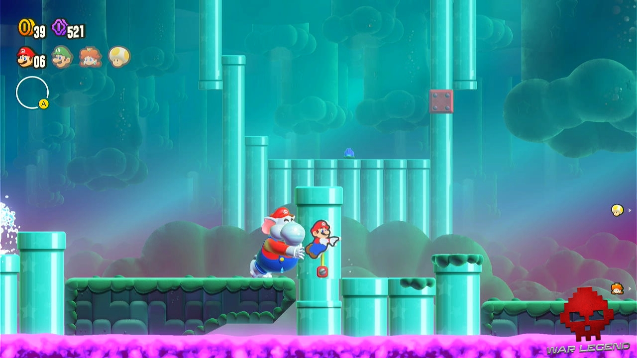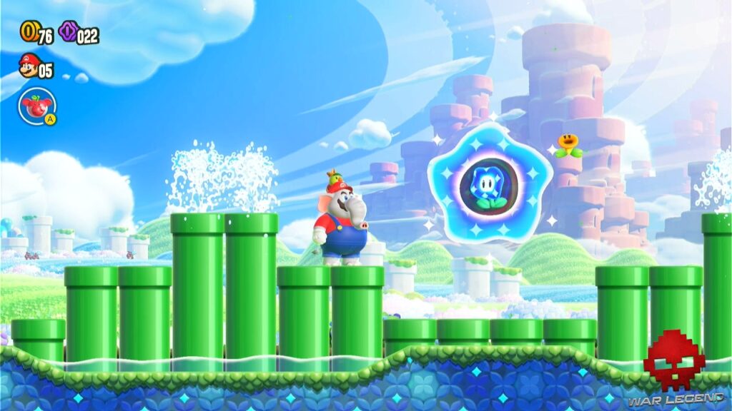 Pourtant, par succession de petites touches, on sent que Nintendo était très investi dans Super Mario Bros. Wonder, à une époque où les épisodes 3D sont désormais perçus les grands événements qui rythment les consoles de Big N. Quelques power-ups inédits apportent ce petit sentiment de nouveauté attendu et nécessaire, mais force est de reconnaître leur utilité multifonction, comme la forme d’éléphant qui a déjà fait le tour du net, permettant de casser des blocs à coups de trompes ou bien de transporter de l’eau utile pour divers puzzles, ou bien le lancer de bulles qui se révèle être une arme redoutable et idéale pour atteindre des plateformes éloignées avec un brin de créativité.