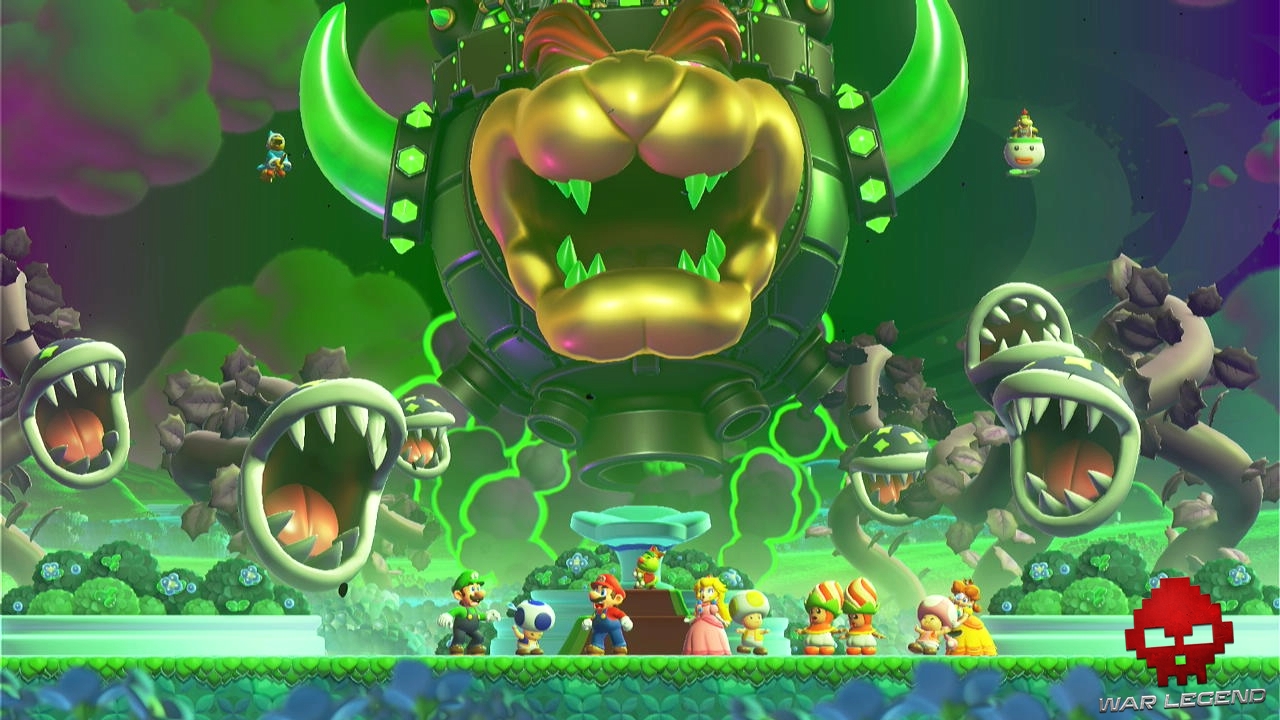 Le premier contact avec Super Mario Bros. Wonder est assez convenu : Mario et ses amis sont en visites au Royaume des fleurs… et Bowser débarque pour gâcher la fête, comme d’hab’. Mais le roi des Koopas a évidemment une idée derrière la tête : utiliser le pouvoir des Fleurs prodiges pour modeler la réalité à sa convenance. Voilà Bowser que se transforme forteresse, gigantesque et inarrêtable.