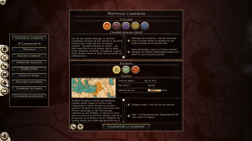 C’est dans ce contexte que la campagne commence. Première nouveauté : la présence de factions héroïques. Au nombre de cinq (Palmyre, Gaule romaine, Rome, les Sassanides et les Goths), elles sont censées avoir « des conditions de victoire différentes ainsi que des chaînes d’événements spéciales qui explorent l’histoire des personnages célèbres de cette ère« . Pour des raisons de cohérence scénaristique, ces personnages héroïques ne pourront d’ailleurs pas mourir au combat ; au pire, ils quitteront leur poste le temps de recouvrer la santé.