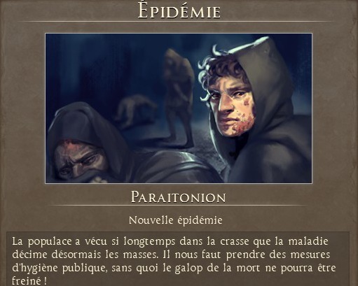 Les épidémies fonctionnent de la même manière que le banditisme, mais à échelle locale : chaque colonie ou capitale a son propre indice d’hygiène ; plus celui-ci est bas, plus les risques d’épidémie sont élevés.