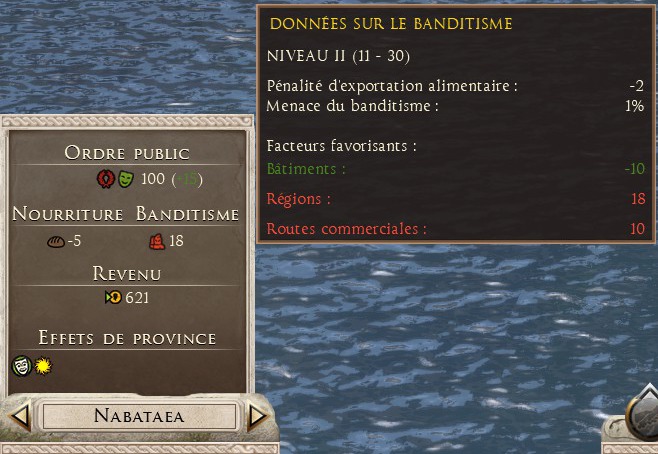 Le banditisme est un facteur propre à chaque province. Certains bâtiments réduisent le banditisme, comme la Villa du procurateur et ses améliorations. Le banditisme a des répercussions sur l’exportation alimentaire ; de plus, chaque tour, il y a un risque que le banditisme déclenche des événements néfastes dans votre province.