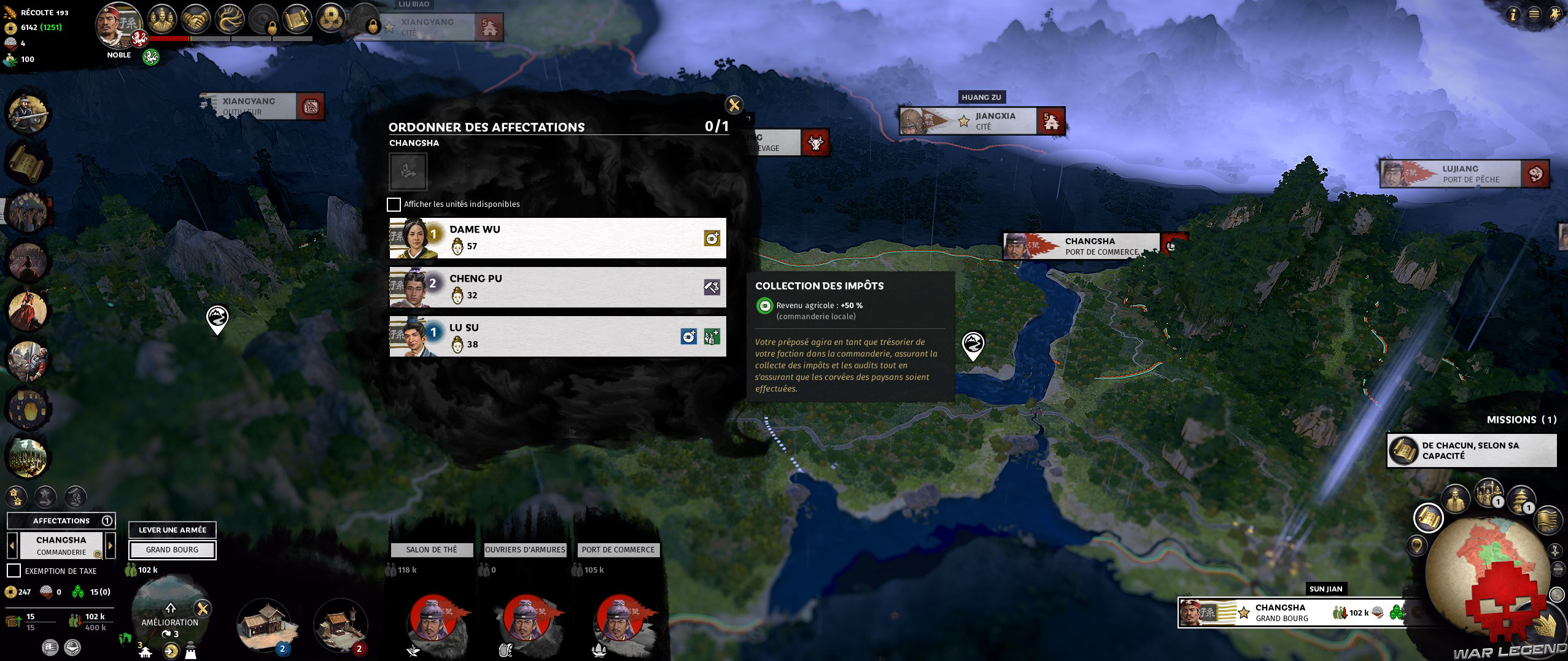À côté de l’espionnage demeure la possibilité de traiter avec les factions adverses au grand jour. Bon, il faut y aller avec patience parce que, il faut bien le dire, elles se montrent un peu co-connes. Un coup c’est une proposition pour quelque chose qu’on m’a refusé le tour d’avant, l’autre c’est une demande pour rejoindre une guerre contre un type à l’autre bout de la carte… intérêt stratégique ? Zéro. Et je ne parle pas des adversaires frontaliers qui déclarent la guerre, mais ne prennent pas avantage du fait que mes armées sont éloignées de mes villes pour attaquer ces dernières. Si les développeurs ont lu les livres des Trois Royaumes, l’IA n’a pas entendu parler de Sun Tzu.