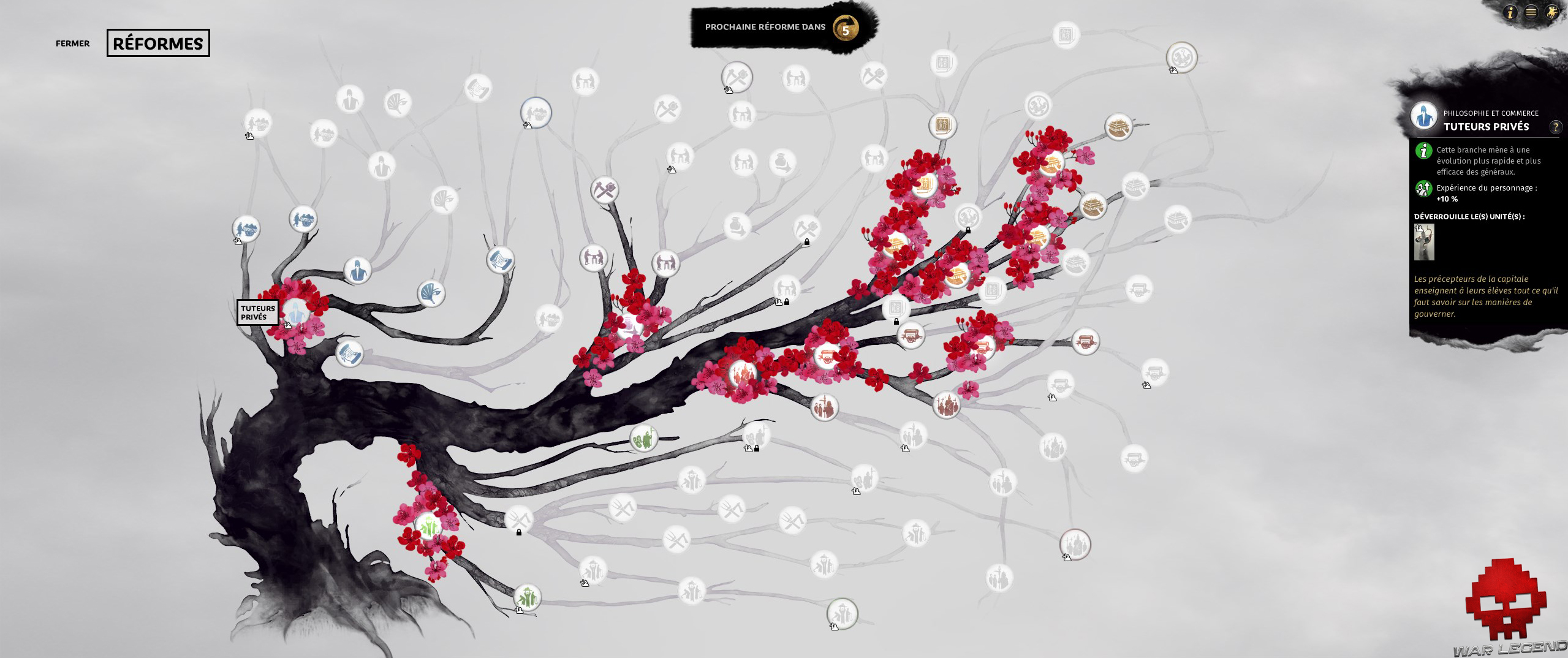 Vos personnages eux aussi peuvent prendre des niveaux. En plus de l’équipement customisable, des compétences se débloquent selon un arbre qui permet de faire évoluer les héros. Chacune augmente les statistiques, ce qui permet de spécialiser un noble (chacun a un profil de base qui l’oriente dans une direction) et d’obtenir divers bonus à l’échelle de la faction ou d’une armée, tout dépend comment vous employez la personne.