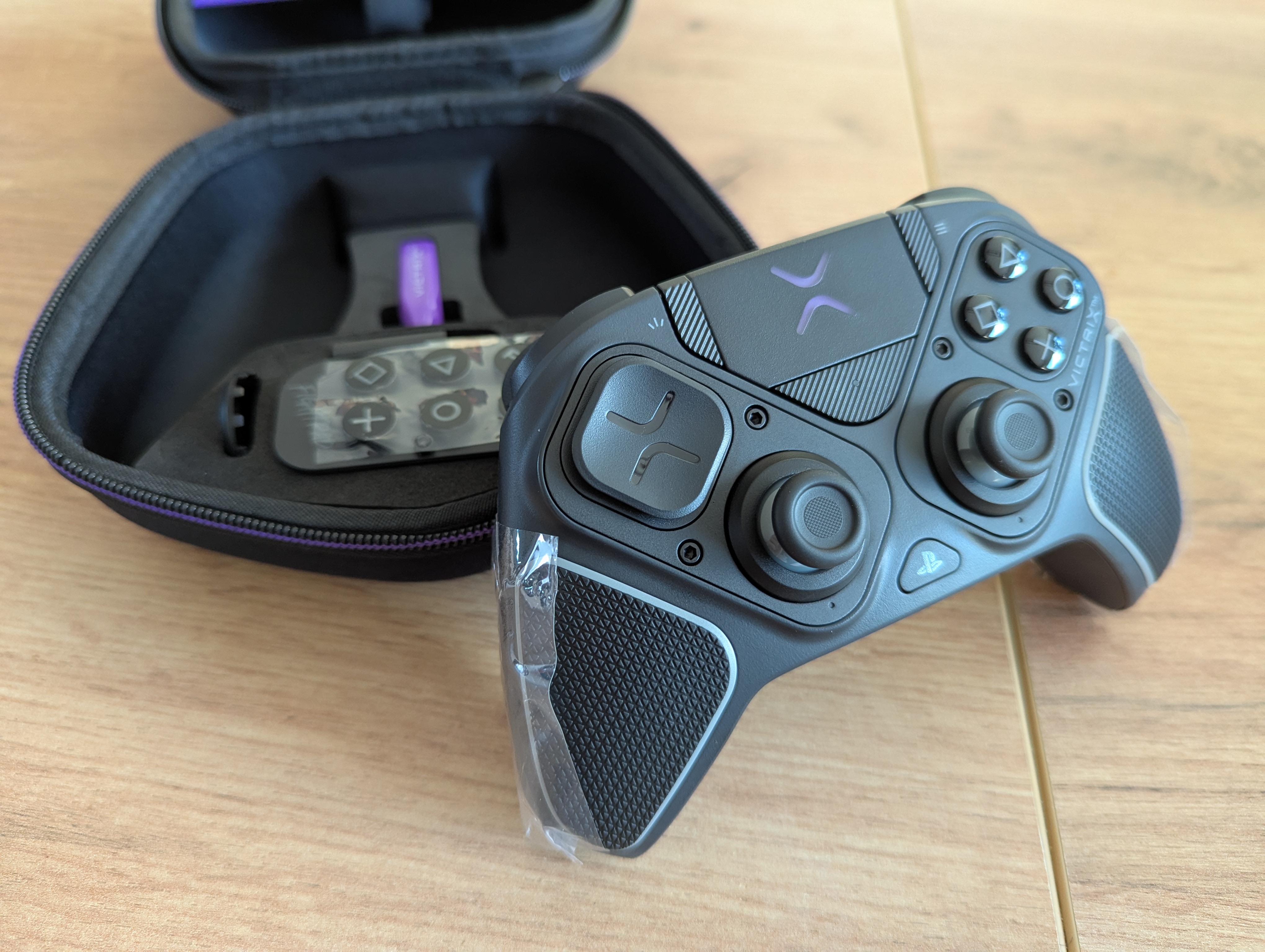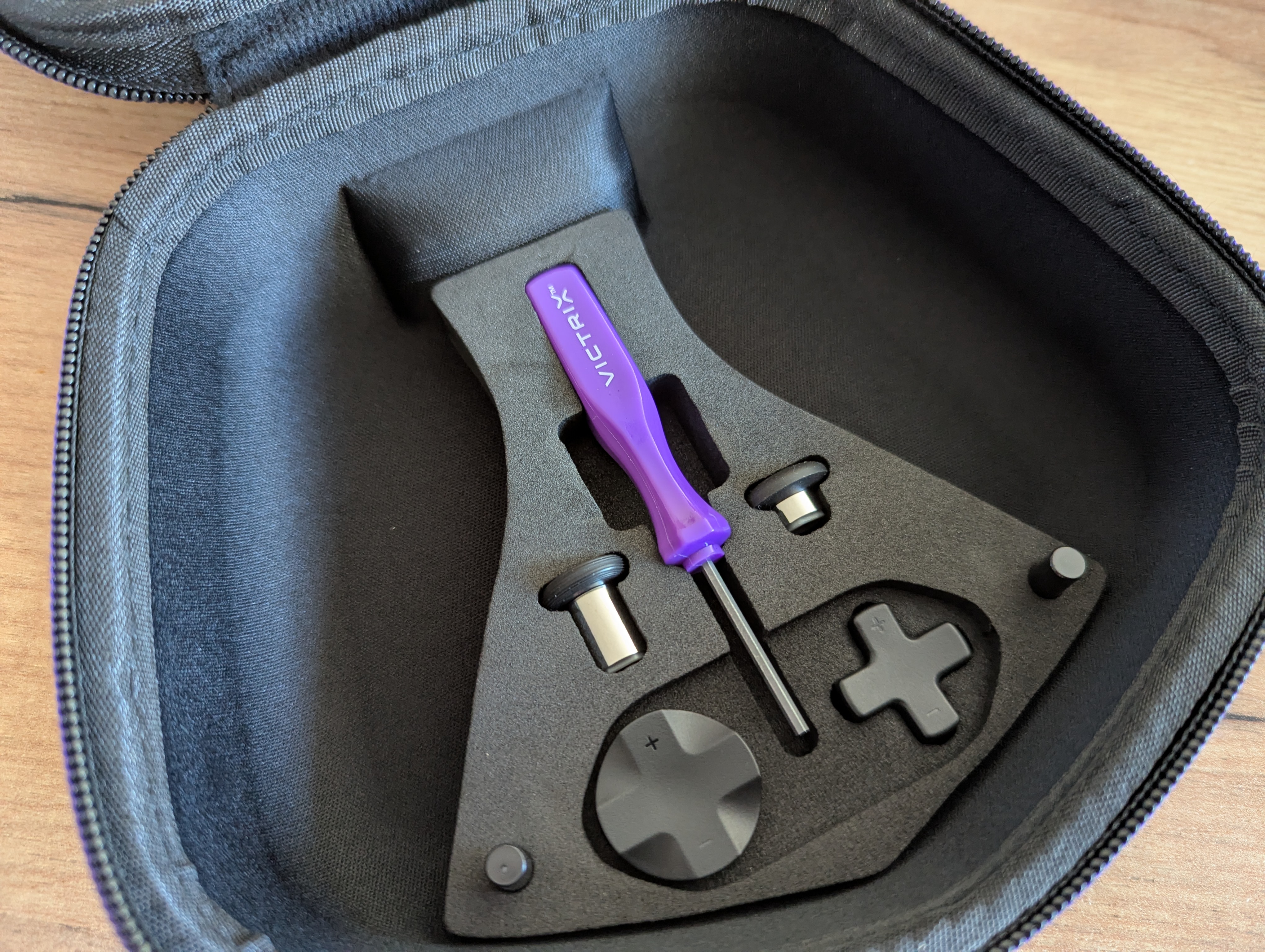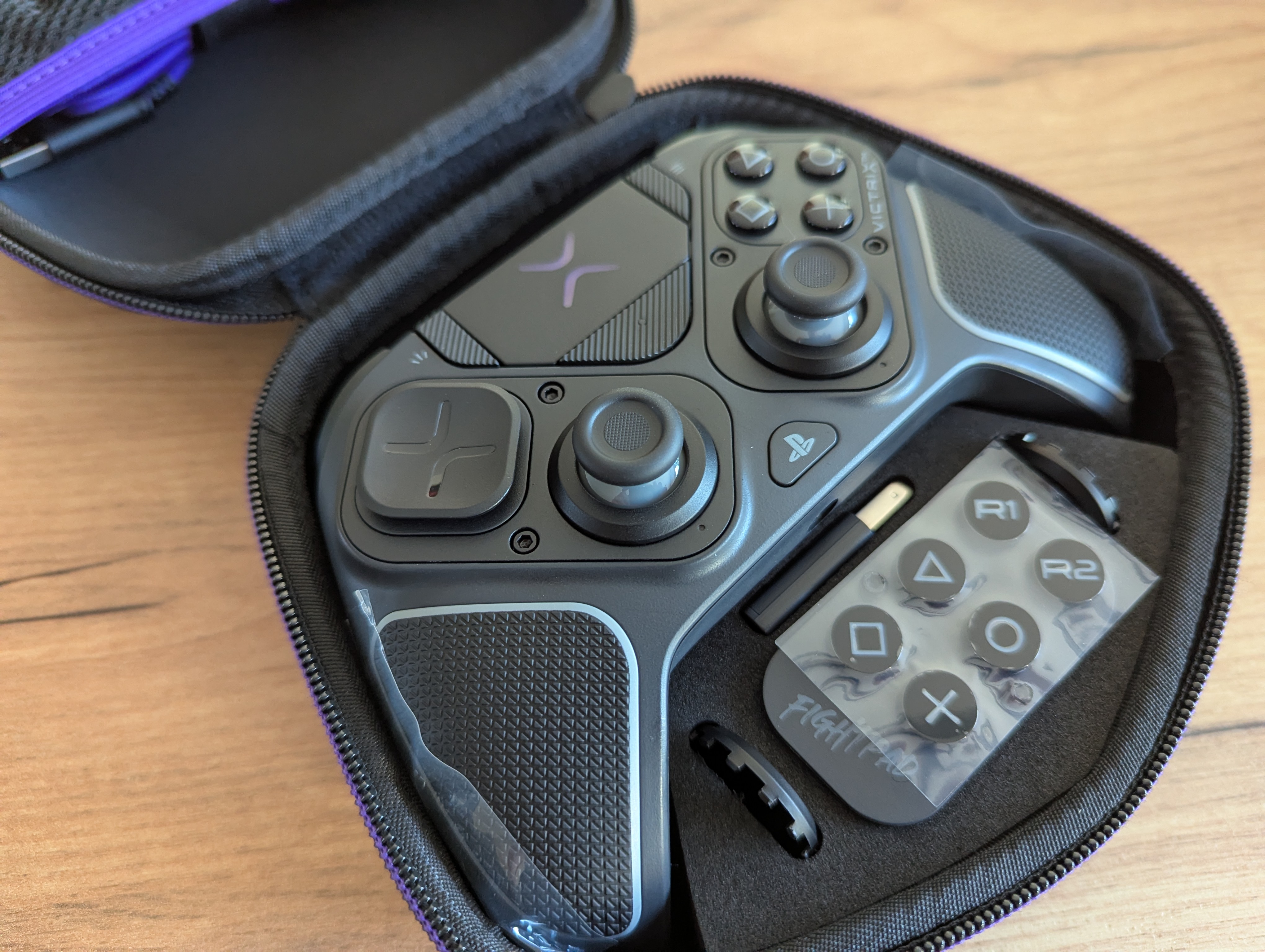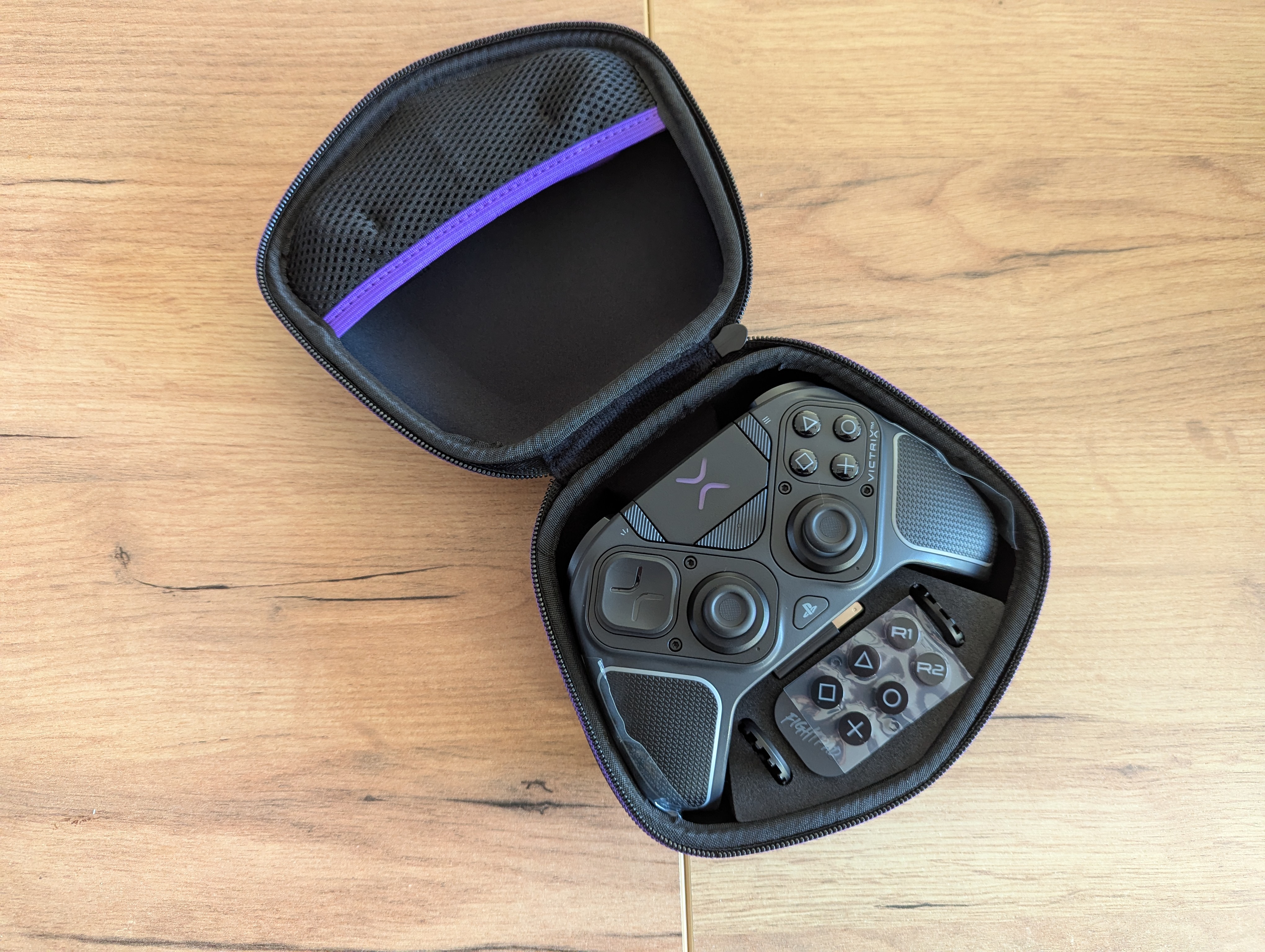 Le déballage de la Victrix Pro BFG Reloaded confirme son positionnement haut de gamme. La manette est lovée dans une robuste housse de transport semi-rigide, qui contient un véritable arsenal pour le joueur exigeant.