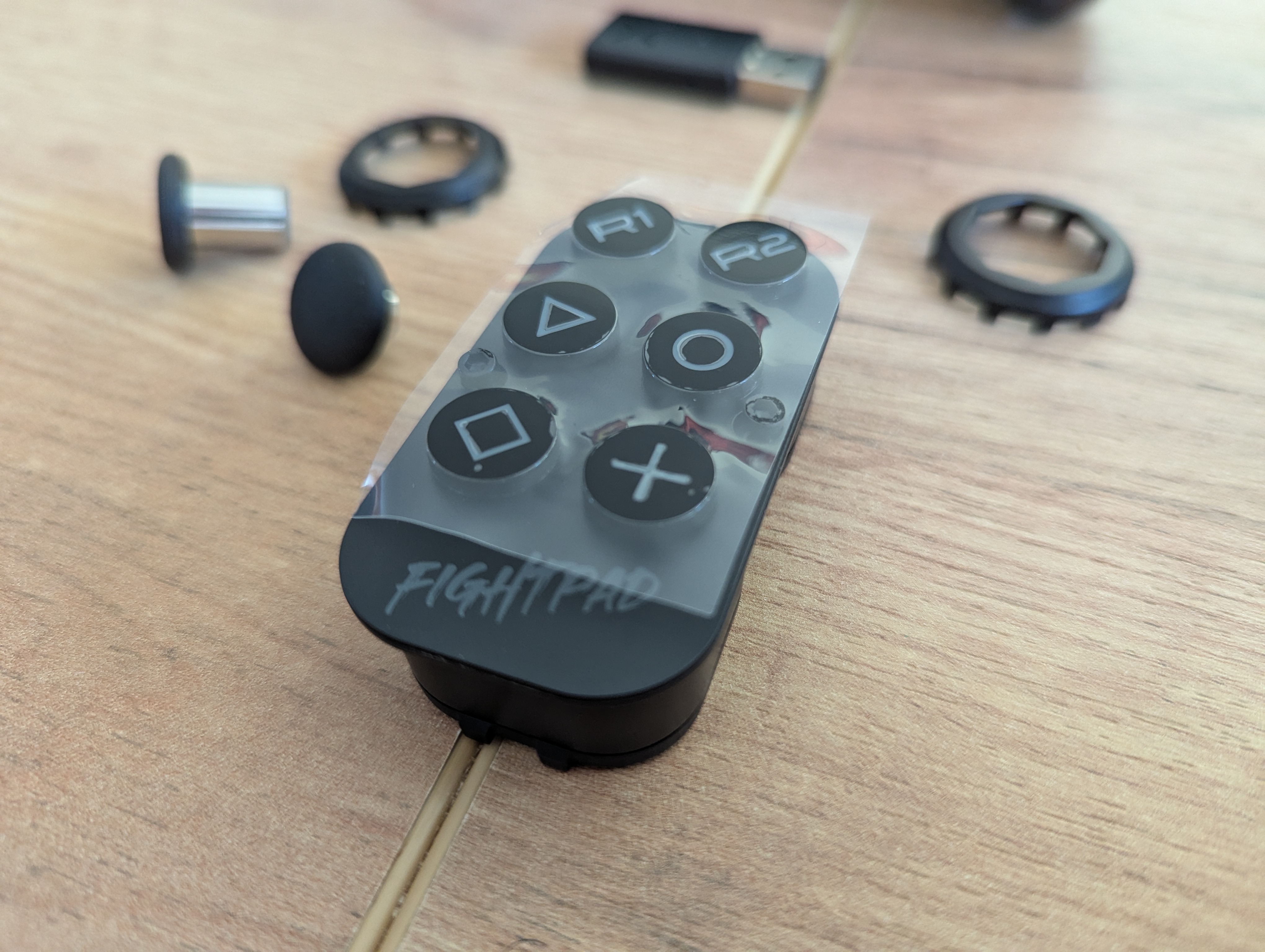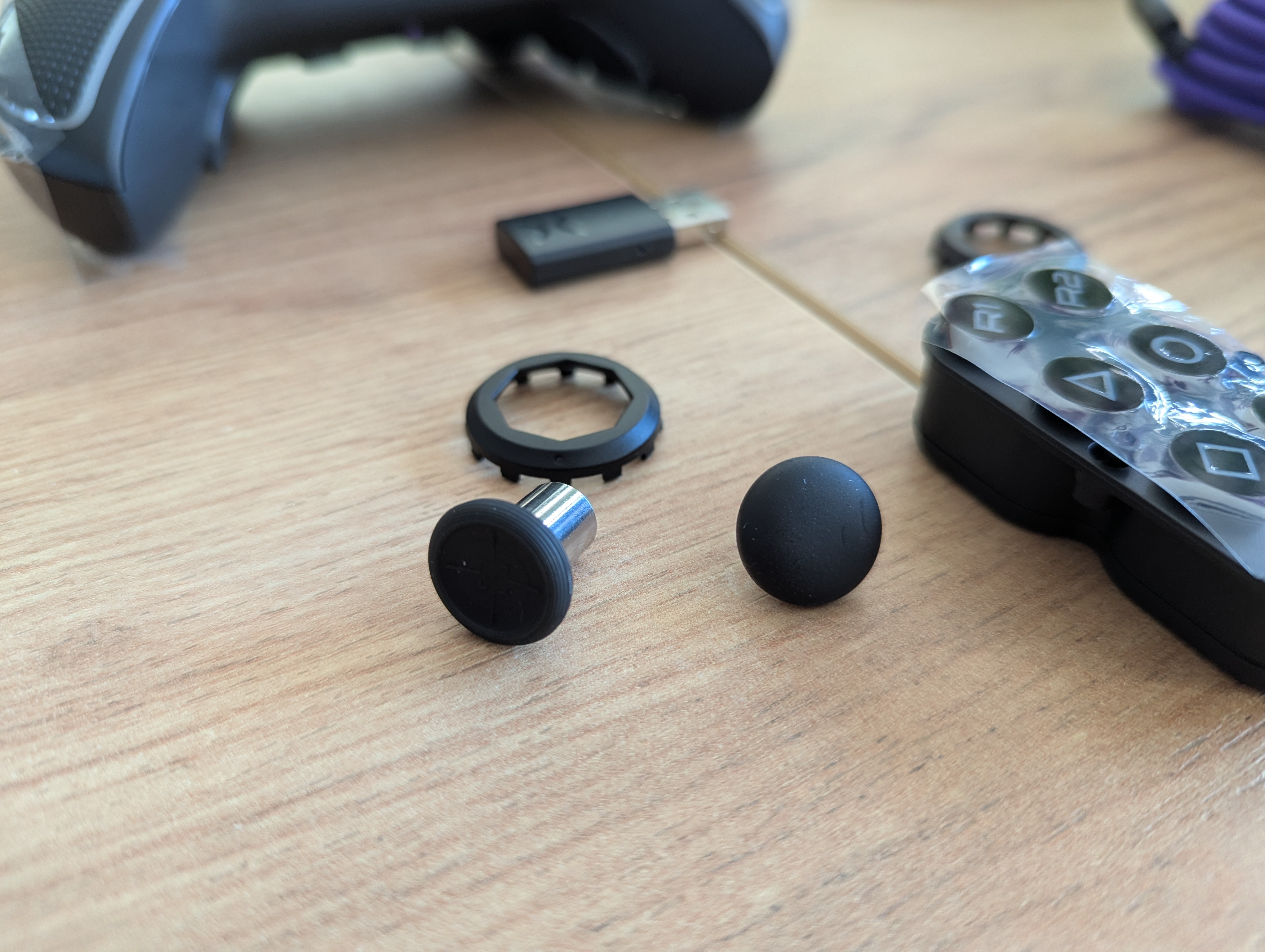 On y retrouve un long câble USB-C tressé de 3 mètres, le dongle USB pour la connexion sans-fil, et surtout, le cœur du concept BFG : la modularité. Le pack inclut plusieurs sticks interchangeables (un grand, un concave), trois croix directionnelles distinctes, et deux « gates » octogonaux pour les sticks. Le fameux module « Fight Pad » à six boutons est bien sûr de la partie.