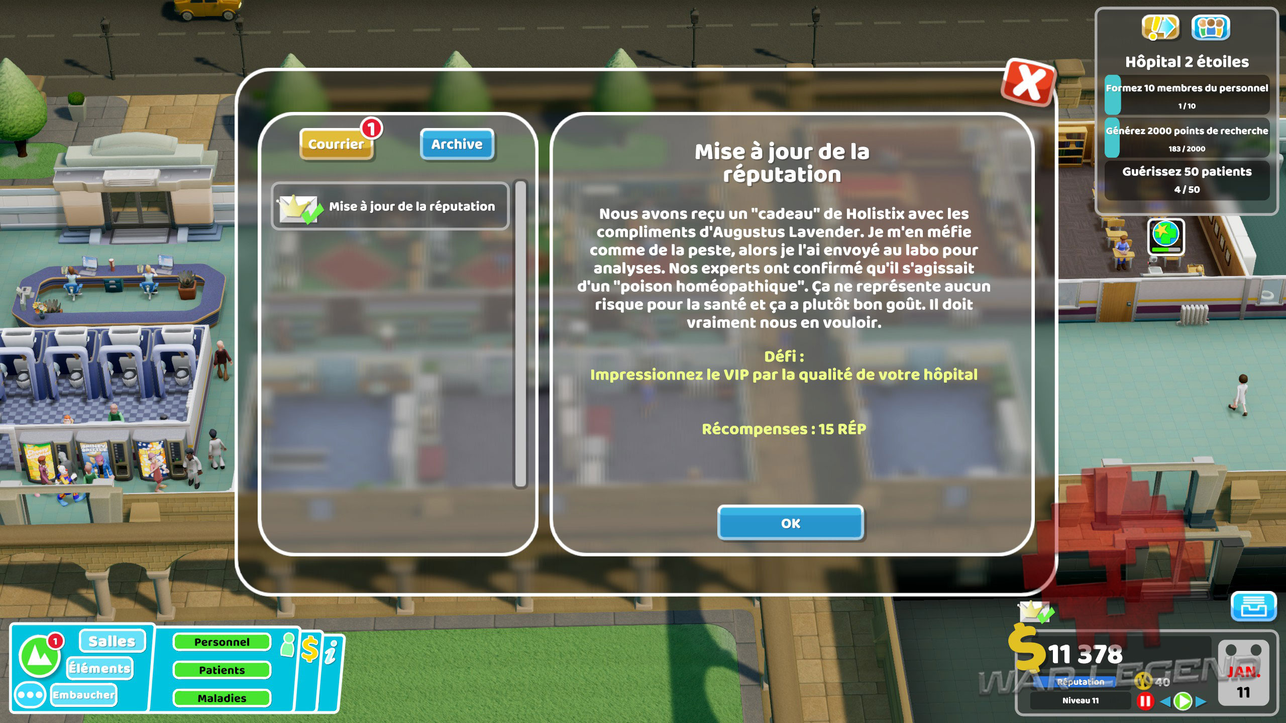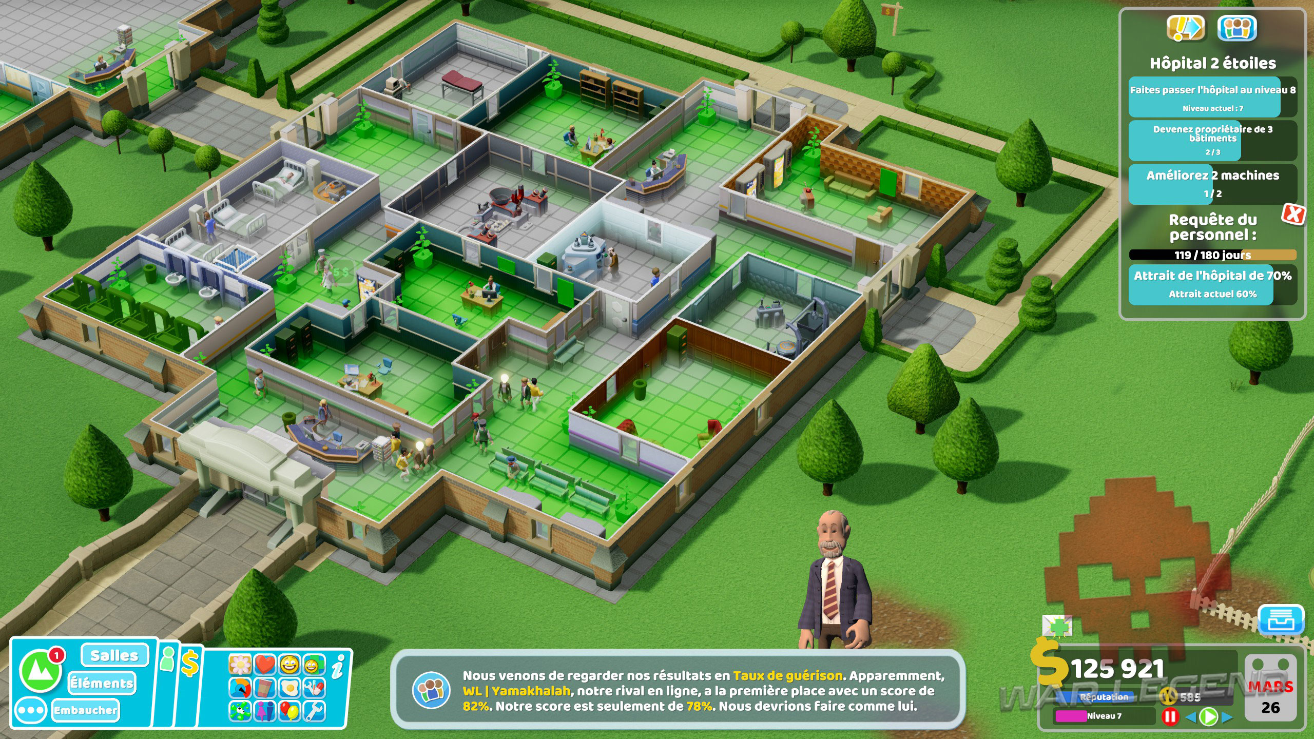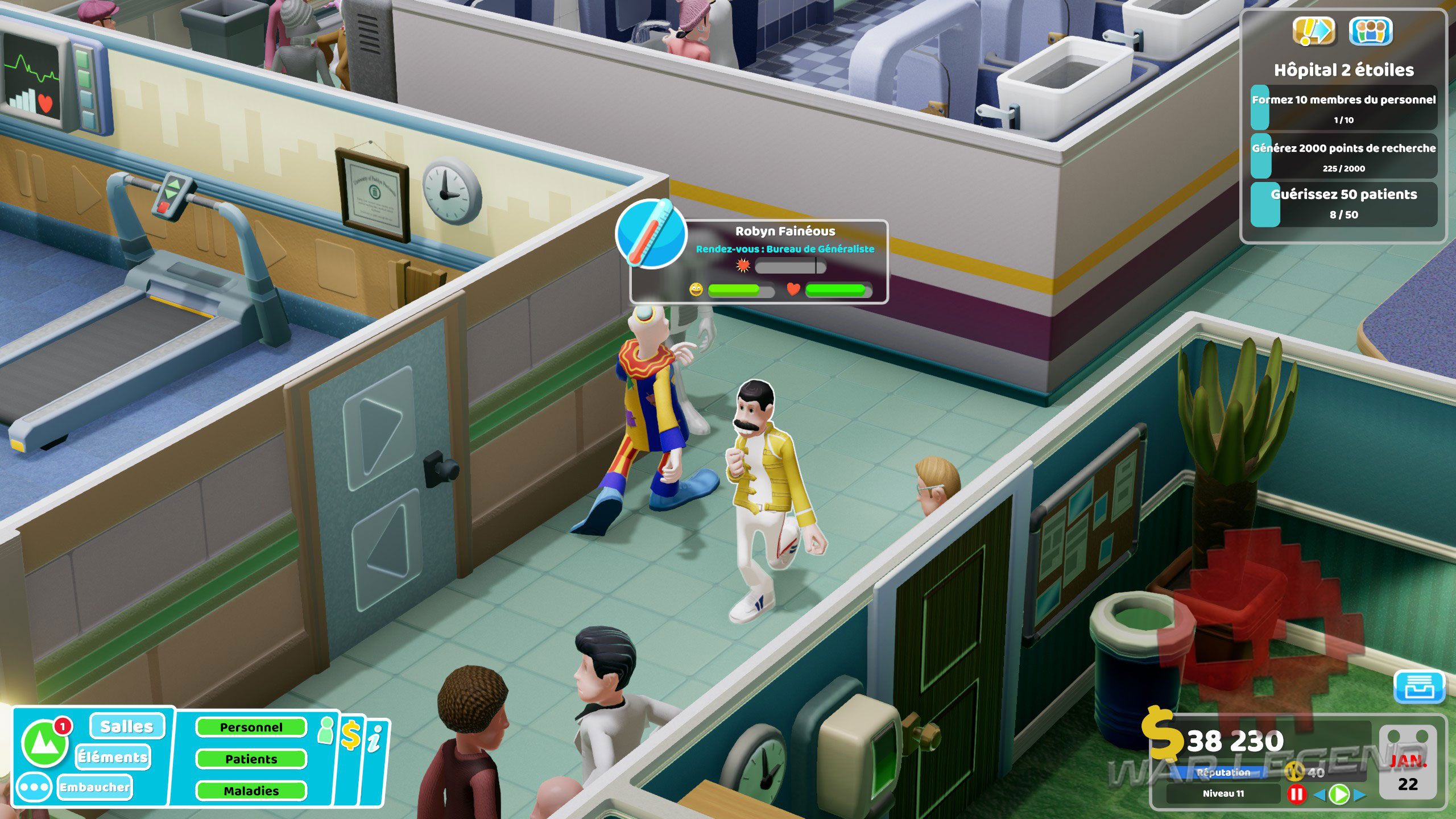 Il est également question dorénavant de soigner sa réputation. En rendant heureux vos patients, en évitant les morts (ça arrive trop souvent en fait) et en impressionnant des VIP, vous obtiendrez un boost de consultations et plus de CV à disposition. Le niveau de votre hôpital calculé à partir du nombre d’employés et de salles compte aussi dans l’équation.