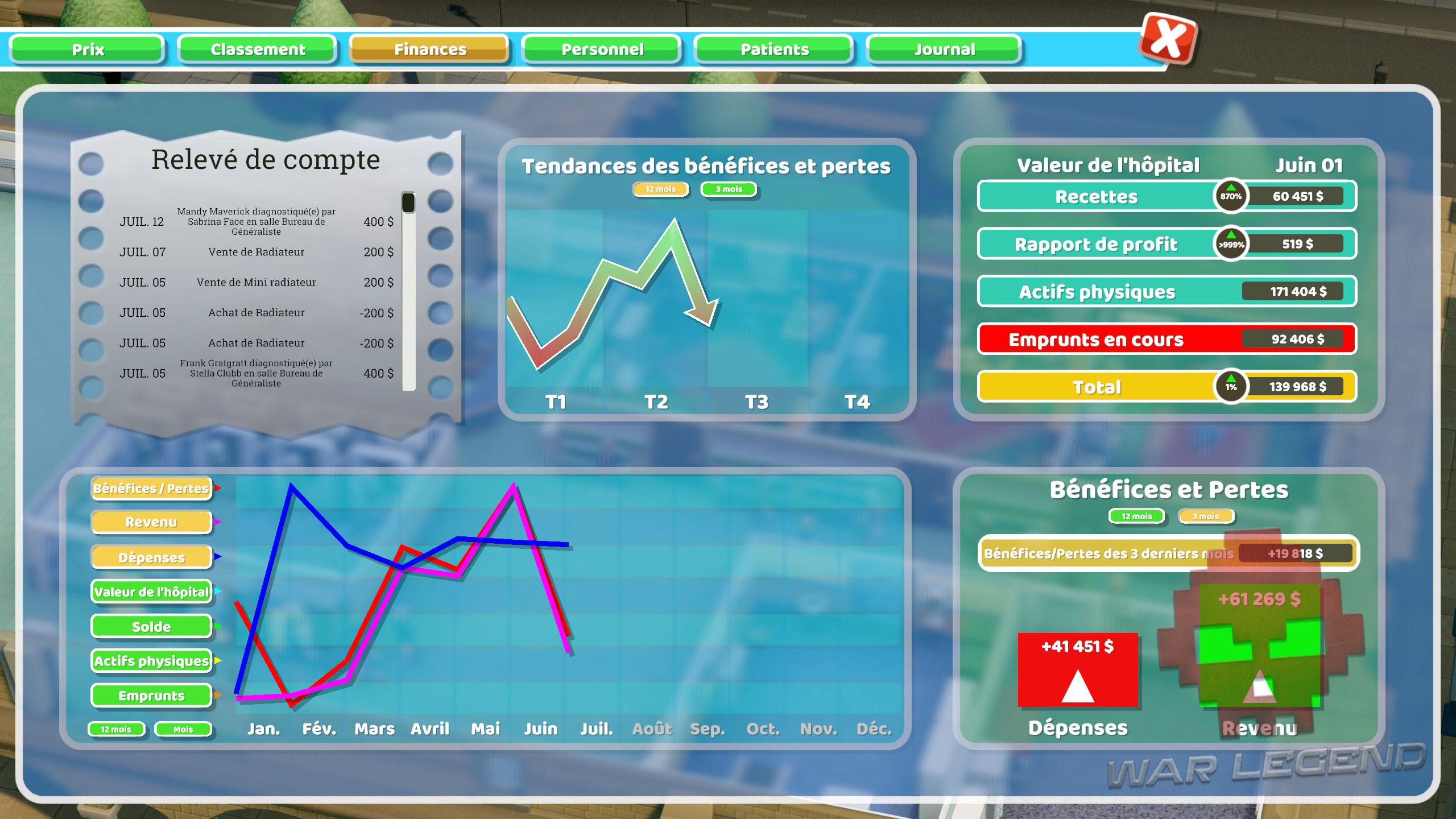 Une fois que le bouzin lancé, il est très peu probable que vous perdiez. Les premiers instants peuvent être tendus financièrement, à cause d’un hôpital vide à équiper un minimum, mais si vous faites les choses correctement et grâce à un système d’emprunt hérité du premier jeu, vous vous en sortirez sans trop d’encombres.
