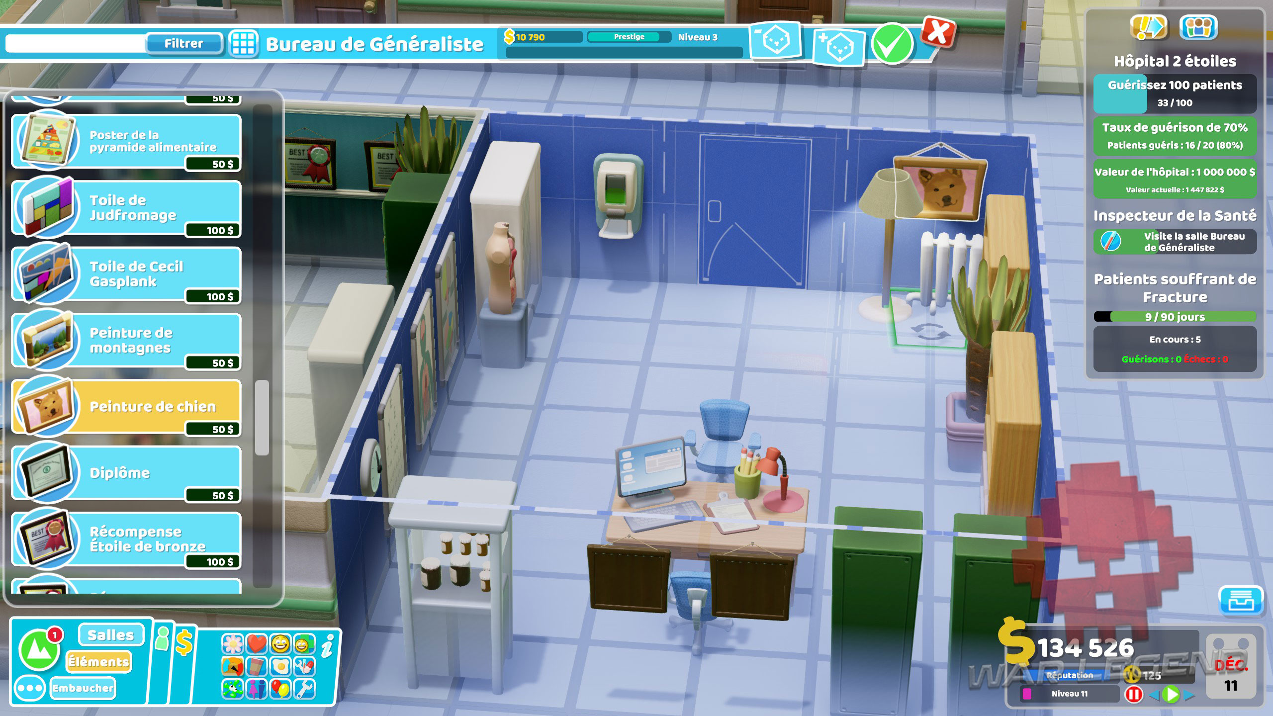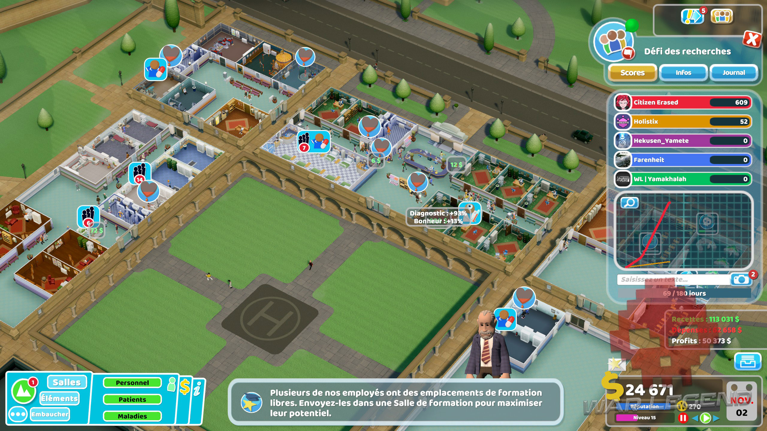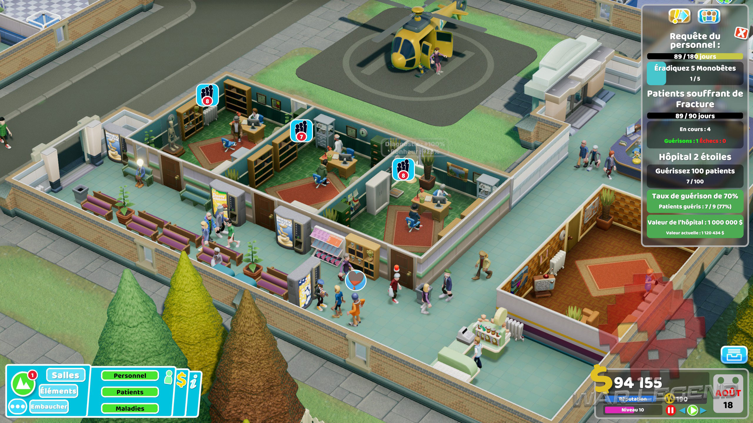 C’est alors un duel entre l’offre et la demande. Au fur et à mesure que vous étoffez l’hôpital, il faudra rester dans la course et arriver à satisfaire vos clients patients tout en arrivant garder la tête hors de l’eau sur tous les aspects. Il ne faut pas hésiter à multiplier le nombre de pièces pour garder les salles d’attente les moins saturées possible.