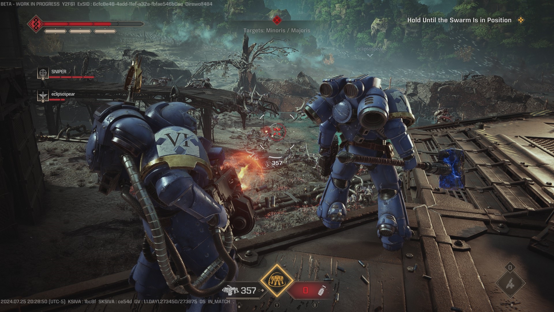 Le cycle de jeu est simple : tirer, se frayer un chemin dans la mêlée, se régénérer grâce aux exécutions brutales, et recommencer. Ce qui différencie Space Marine 2 des autres TPS, c’est la densité de l’ennemi. L’héritage de la série World War Z par Saber Interactive est évident et a été mis au service du dark millenium : les Tyranides ne sont pas des ennemis par vagues, mais des océans de chair chitineuse. Voir des centaines, voire des milliers, de Gaunts, Warriors, et autres abominations organiques se déverser sur vous est un spectacle technique fascinant. L’impact psychologique est immédiat : il ne s’agit plus de chercher une couverture, mais de créer une poche de sécurité par la violence pure, d’où le terme souvent évoqué de « horde shooter ».