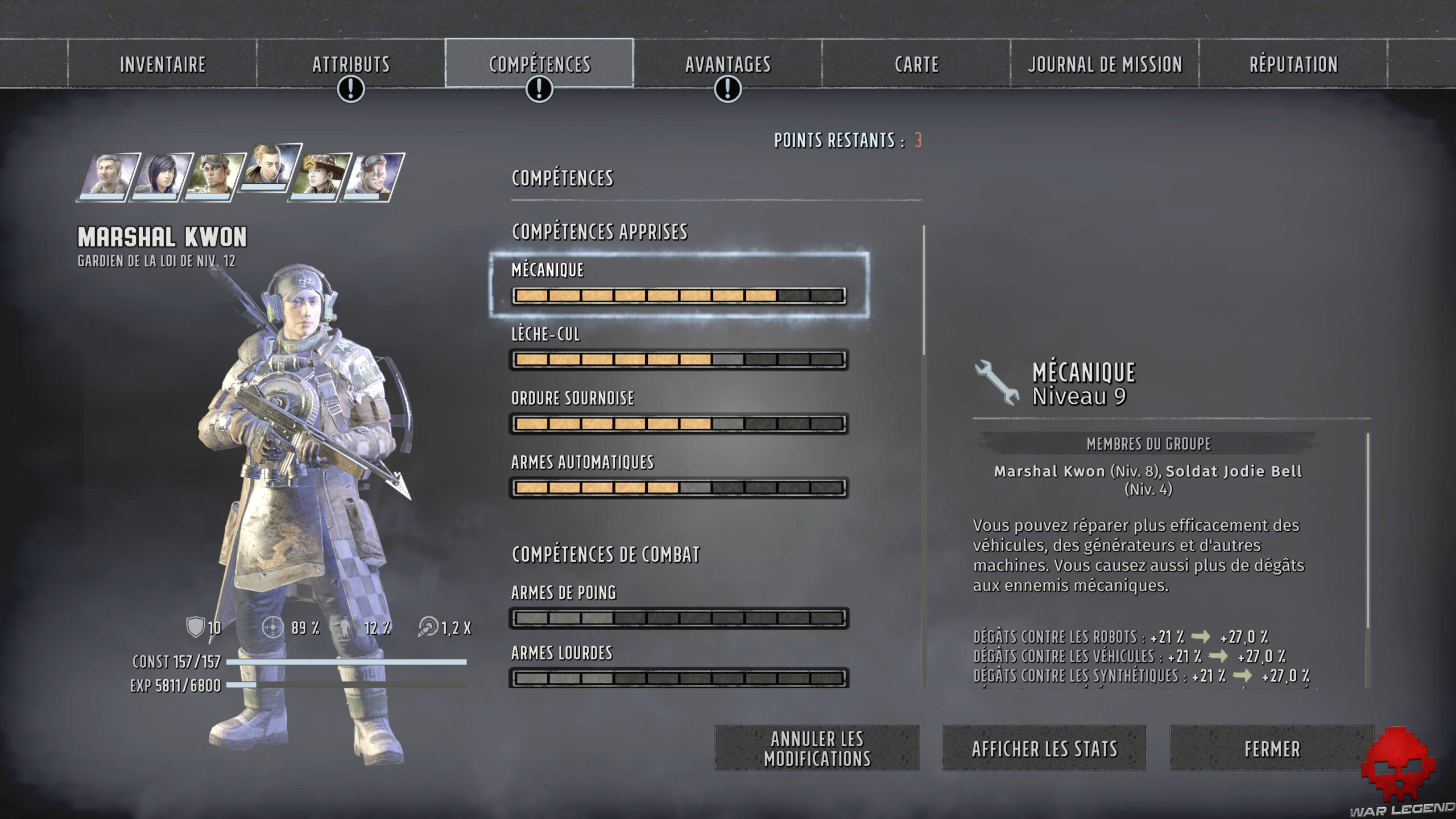 Et puisqu’on parle de caractéristiques, celles de Wasteland 3 sont plutôt efficaces, même si elles peuvent sembler un peu compliquées de prime abord. On retrouve ainsi des attributs, des compétences et des avantages. Cela permet d’avoir une évolution plutôt équilibrée et en même temps spécialisée, puisqu’on nous fait comprendre très vite que sans spécialisation, ça va vite se révéler compliqué.