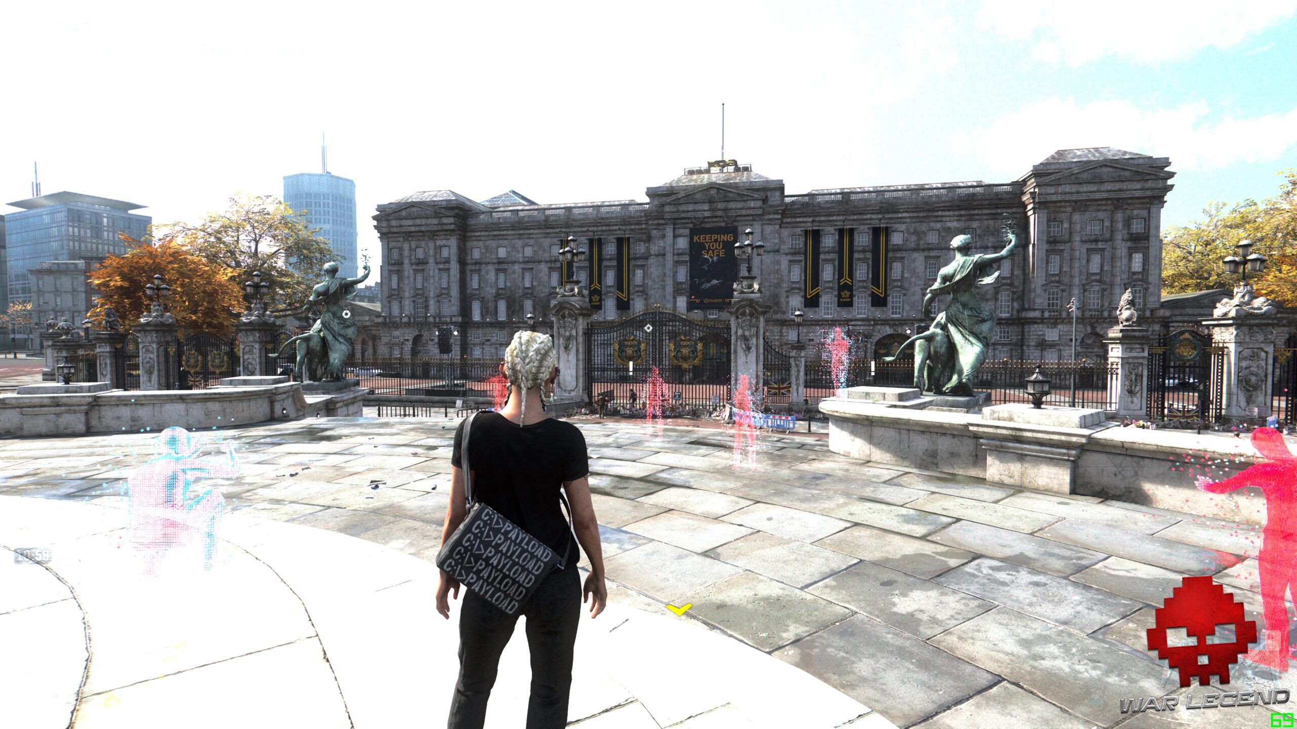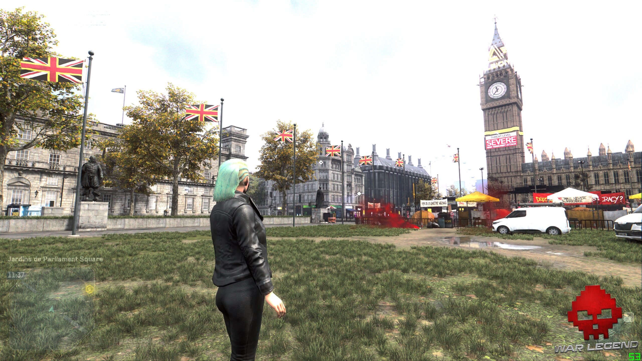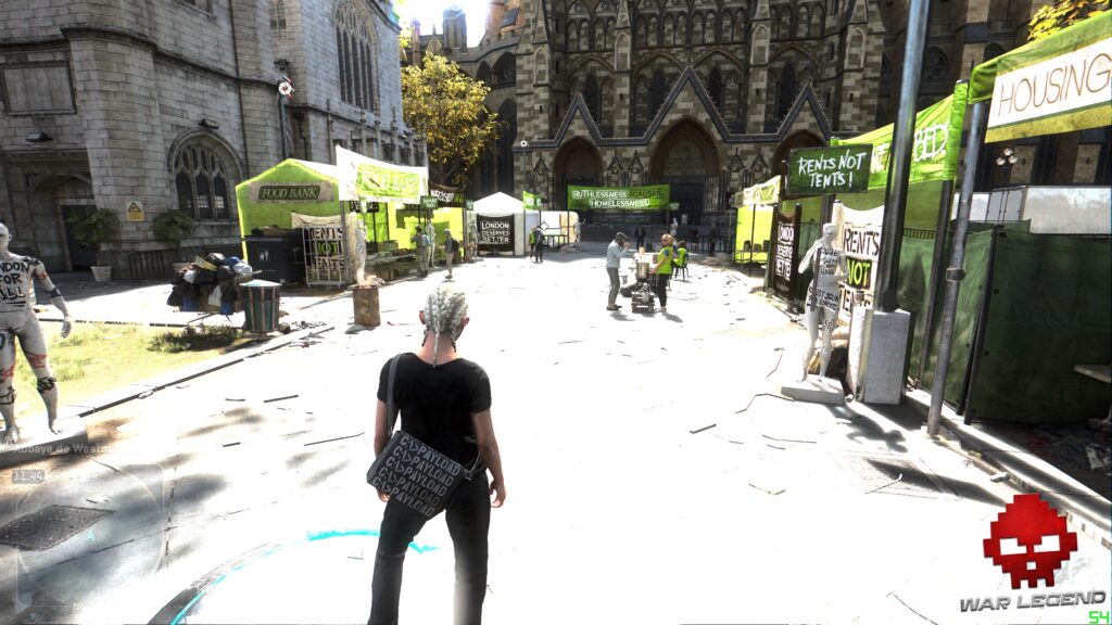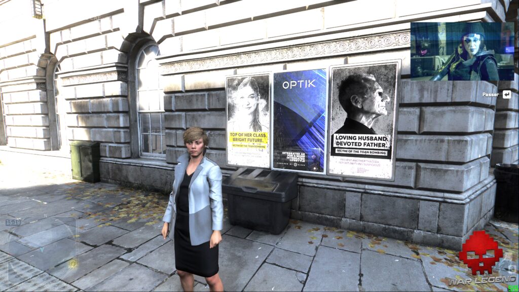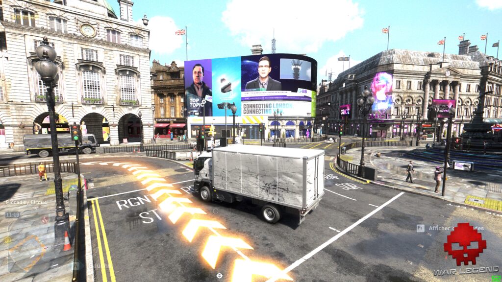 Pour une société qui se défend d’avoir des messages politiques dans ses jeux, Watch Dogs Legion a tout d’un épisode anxiogène de Black Mirror, où le titre multiplie d’ailleurs les références à la série. La Livre sterling s’est effondrée, remplacée par une cryptomonnaie, les oreillettes de réalité augmentée sont communes, de nombreux monuments et lieux historiques ont été privatisés, voire militarisés pour garder la population en ordre, et la surveillance généralisée permet de connaître l’agenda et les relations d’une personne en temps réel.