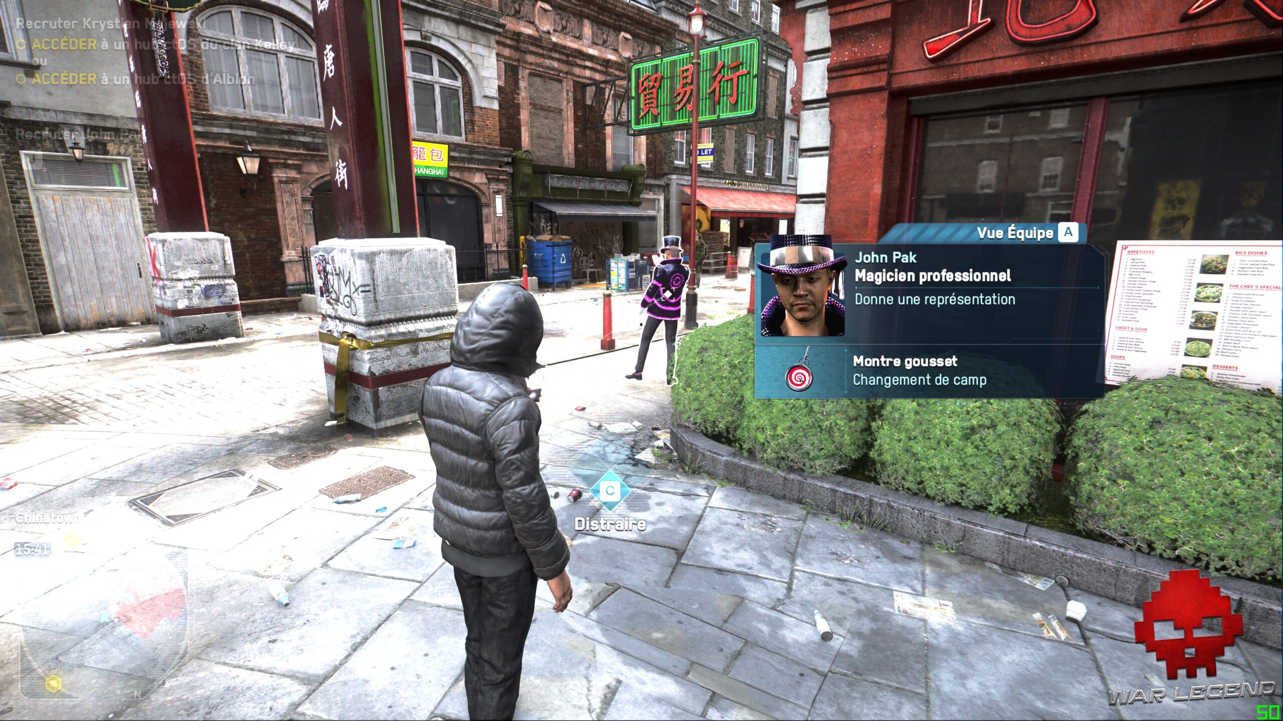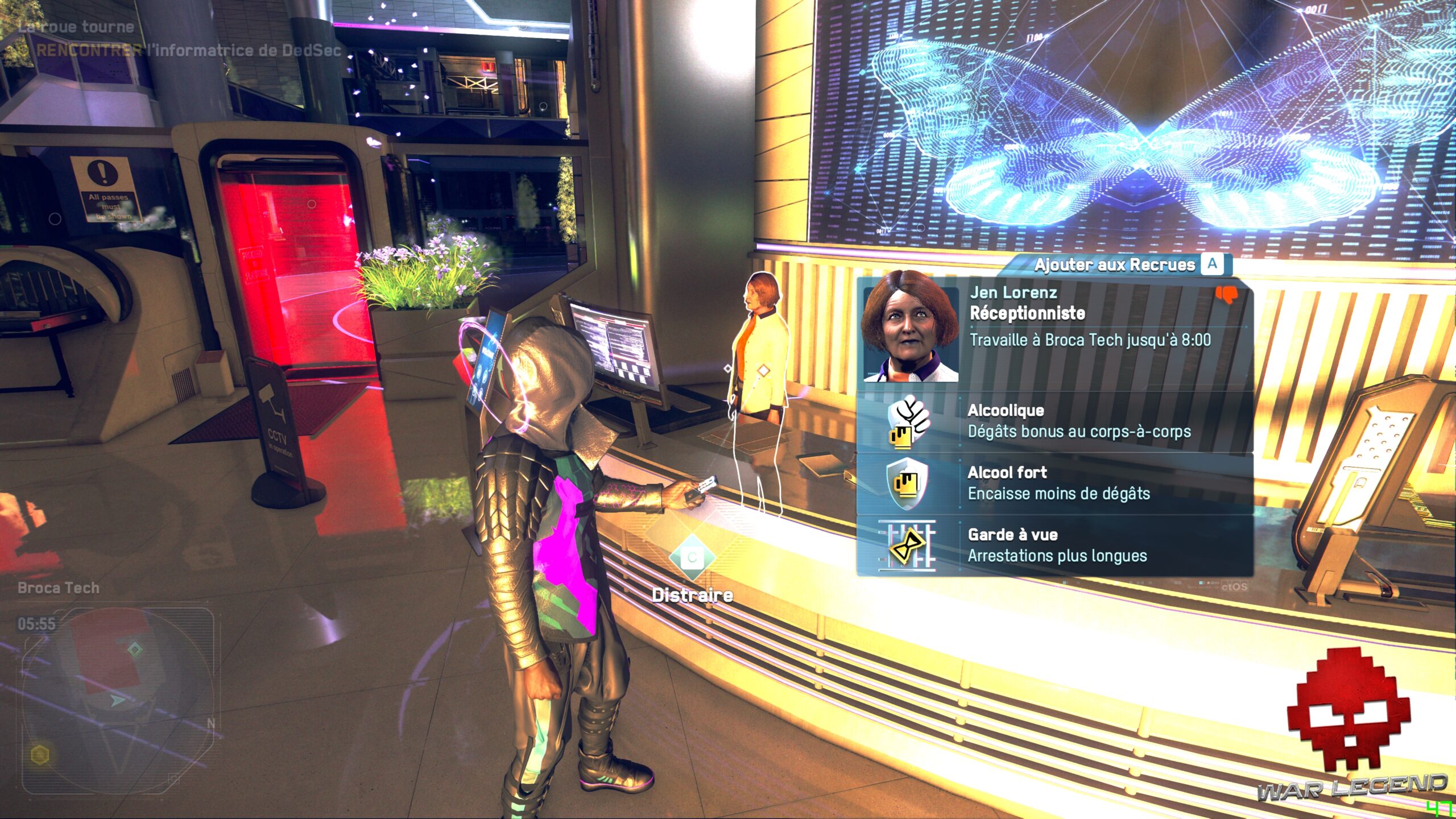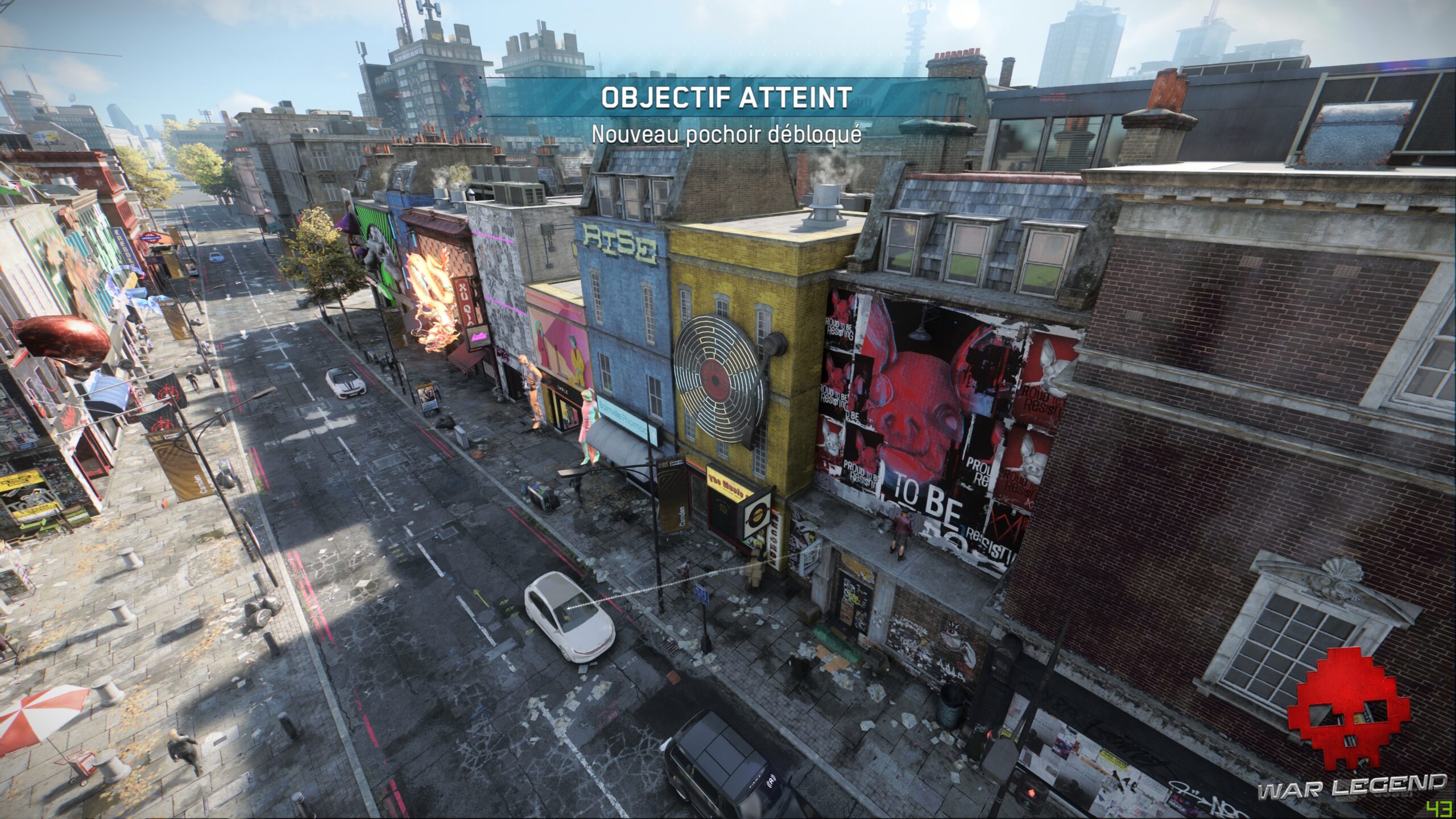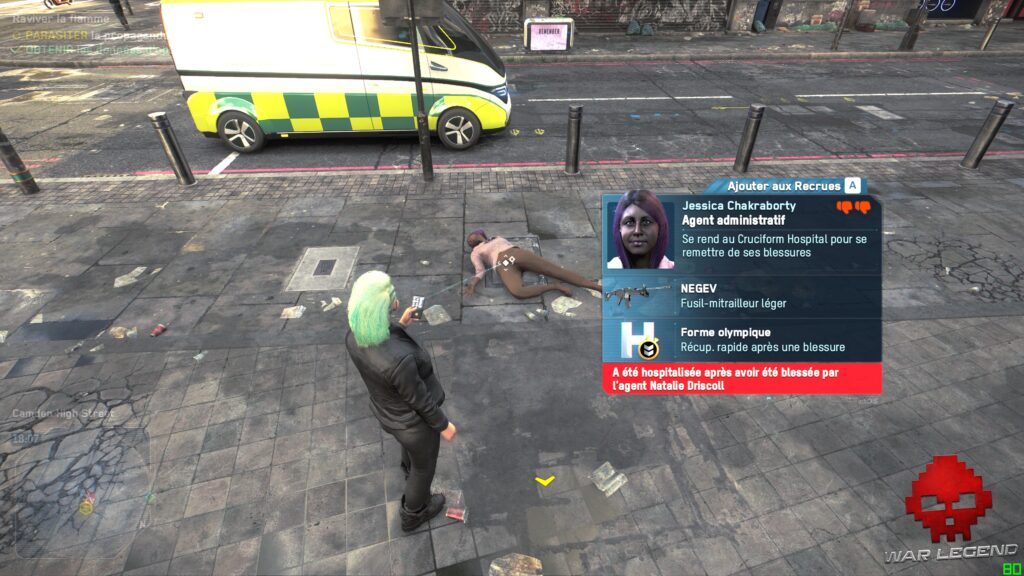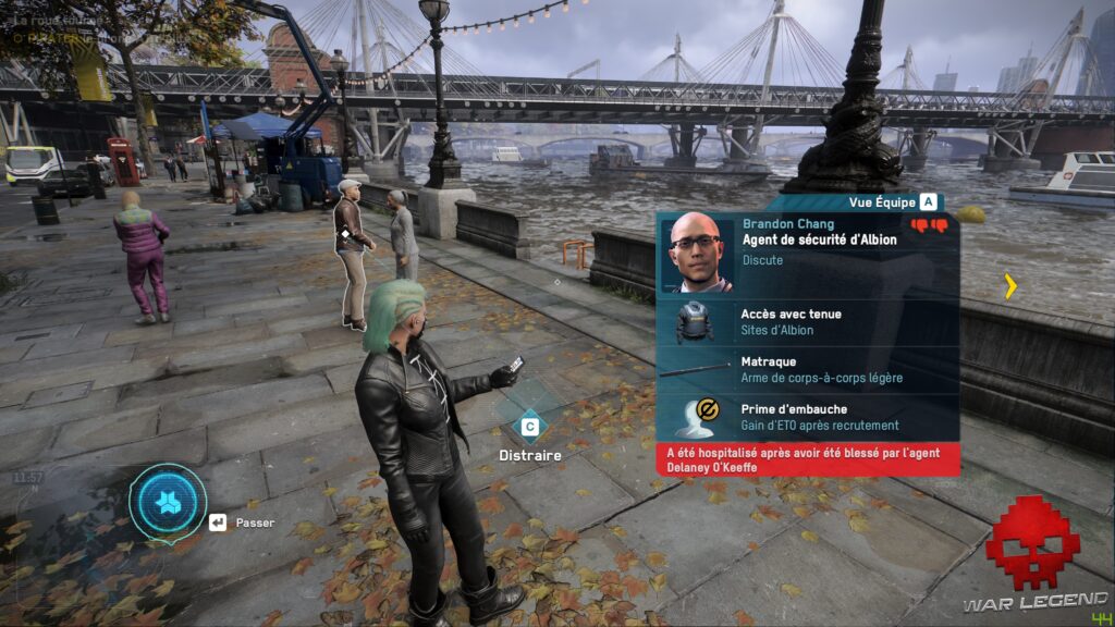 La principale innovation apportée par Legion, c’est la possibilité d’incarner n’importe qui après une courte phase de recrutement. Pas de système de Light RPG lourdingue dont Ubisoft a le secret, mais simplement des compétences liées au personnage que vous contrôlez. Chaque personne croisée dans la rue est susceptible de posséder des capacités qui peuvent se révéler utiles. On peut rapidement être surpris par un banquier expert en explosifs ou d’une mère au foyer qui s’est commandé un fusil d’assaut sur le Dark Net. Heureusement, les mélanges vraiment farfelues sont assez rares, bien qu’il méritent d’exister.
