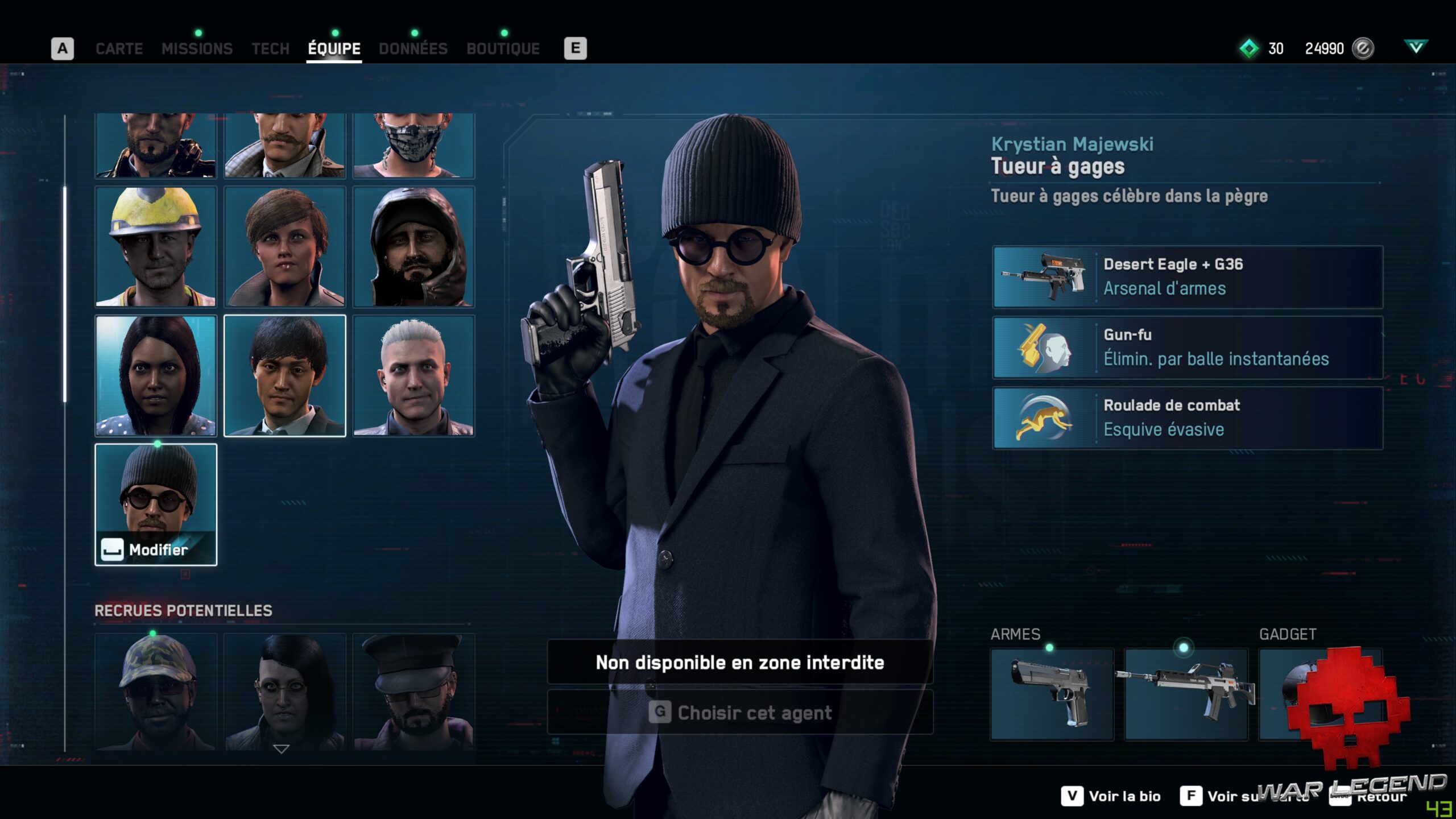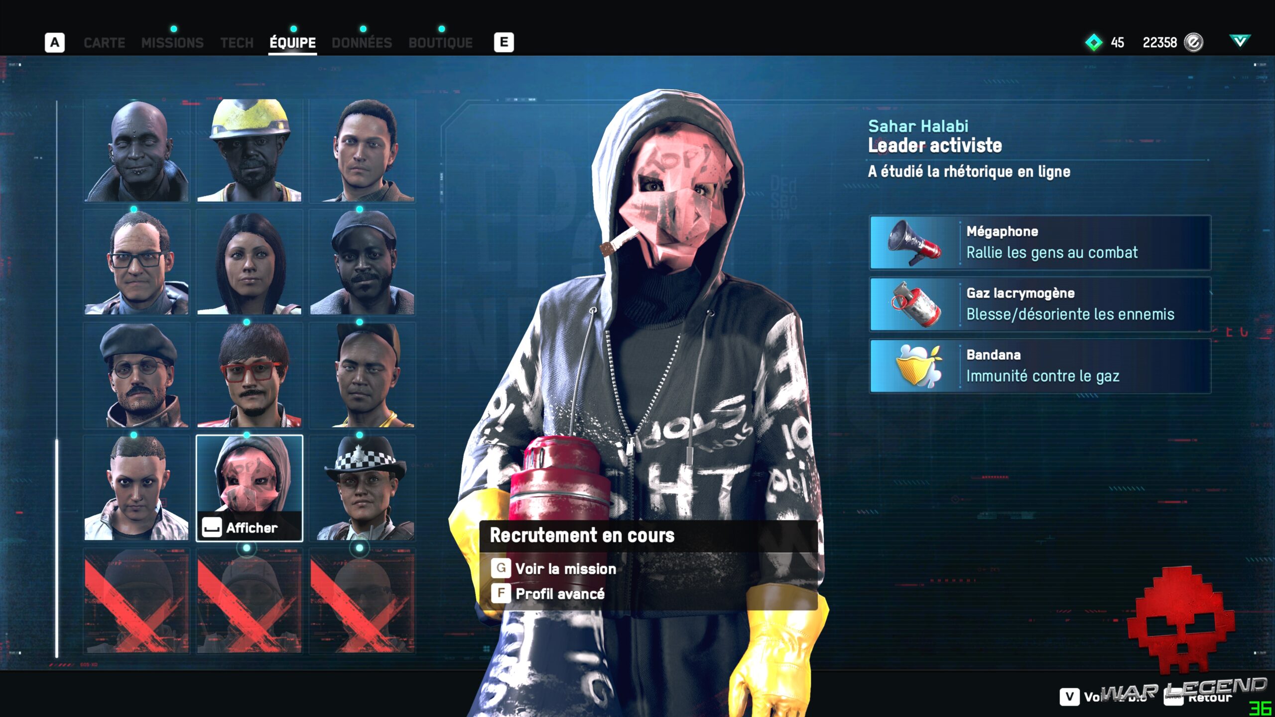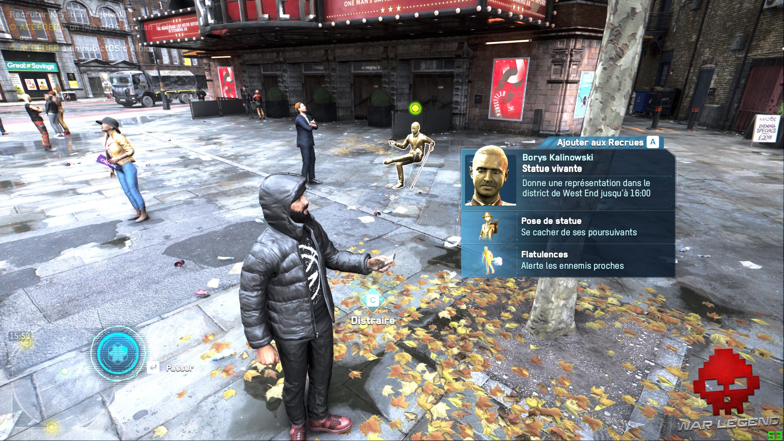 La principale innovation apportée par Legion, c’est la possibilité d’incarner n’importe qui après une courte phase de recrutement. Pas de système de Light RPG lourdingue dont Ubisoft a le secret, mais simplement des compétences liées au personnage que vous contrôlez. Chaque personne croisée dans la rue est susceptible de posséder des capacités qui peuvent se révéler utiles. On peut rapidement être surpris par un banquier expert en explosifs ou d’une mère au foyer qui s’est commandé un fusil d’assaut sur le Dark Net. Heureusement, les mélanges vraiment farfelues sont assez rares, bien qu’il méritent d’exister.