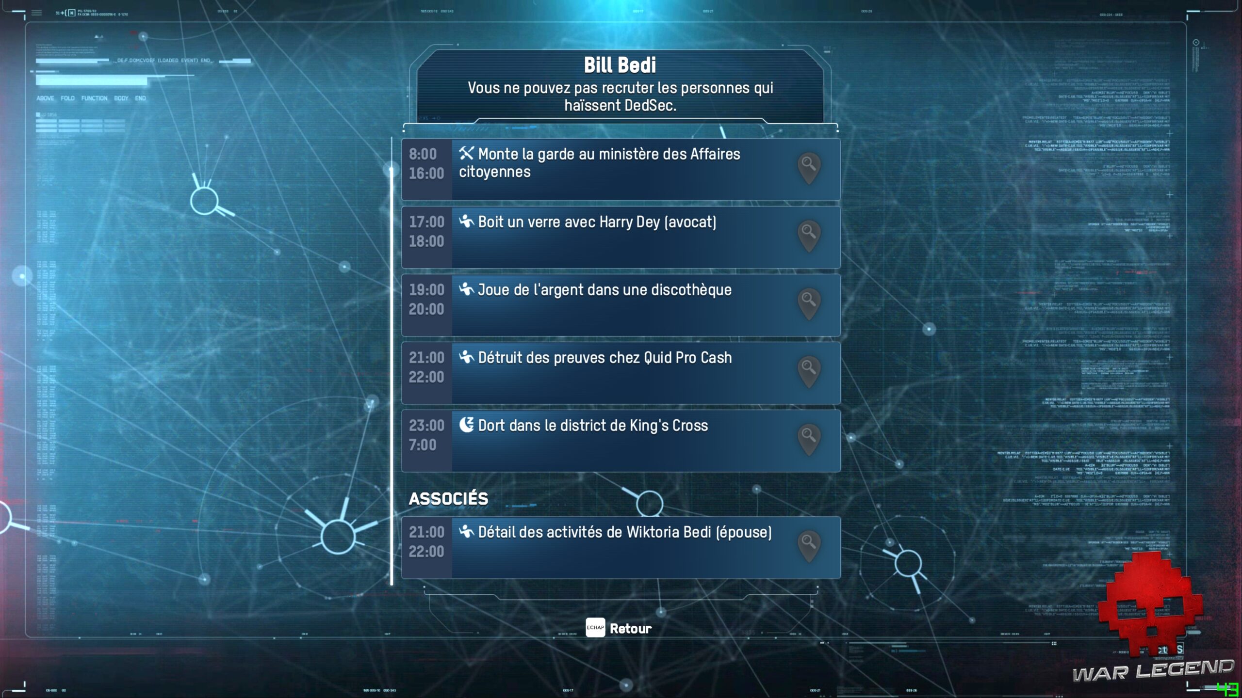 C’est dommage, parce que les fondations de Legion reposent sur des systèmes assez impressionnants quand on se penche dessus. Les habitants de Londres ont tous un train de vie qui leur est propre : ils ont un métier (qui désigne généralement les compétences), un emploi du temps sur 24 heures, un quartier d’habitation désigné et des relations. Bien sûr, la même chose s’appliquer à ces derniers, et ainsi de suite.