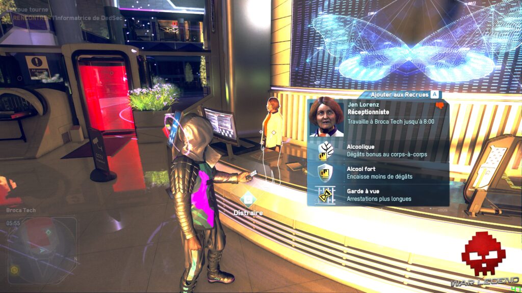 Si vous désirez réellement recruter une personne en particulier, vous pouvez alors consulter son emploi du temps personnel et tenter de lui filer un coup de main sur une tâche particulière afin qu’il accepte de rejoindre Deadsec. C’est très organique et assez vertigineux quand on y pense, mais le potentiel systémique qui en découle n’est jamais réellement exploité. Il y a des fans d’immersive sims qui tueraient pour avoir un système similaire.