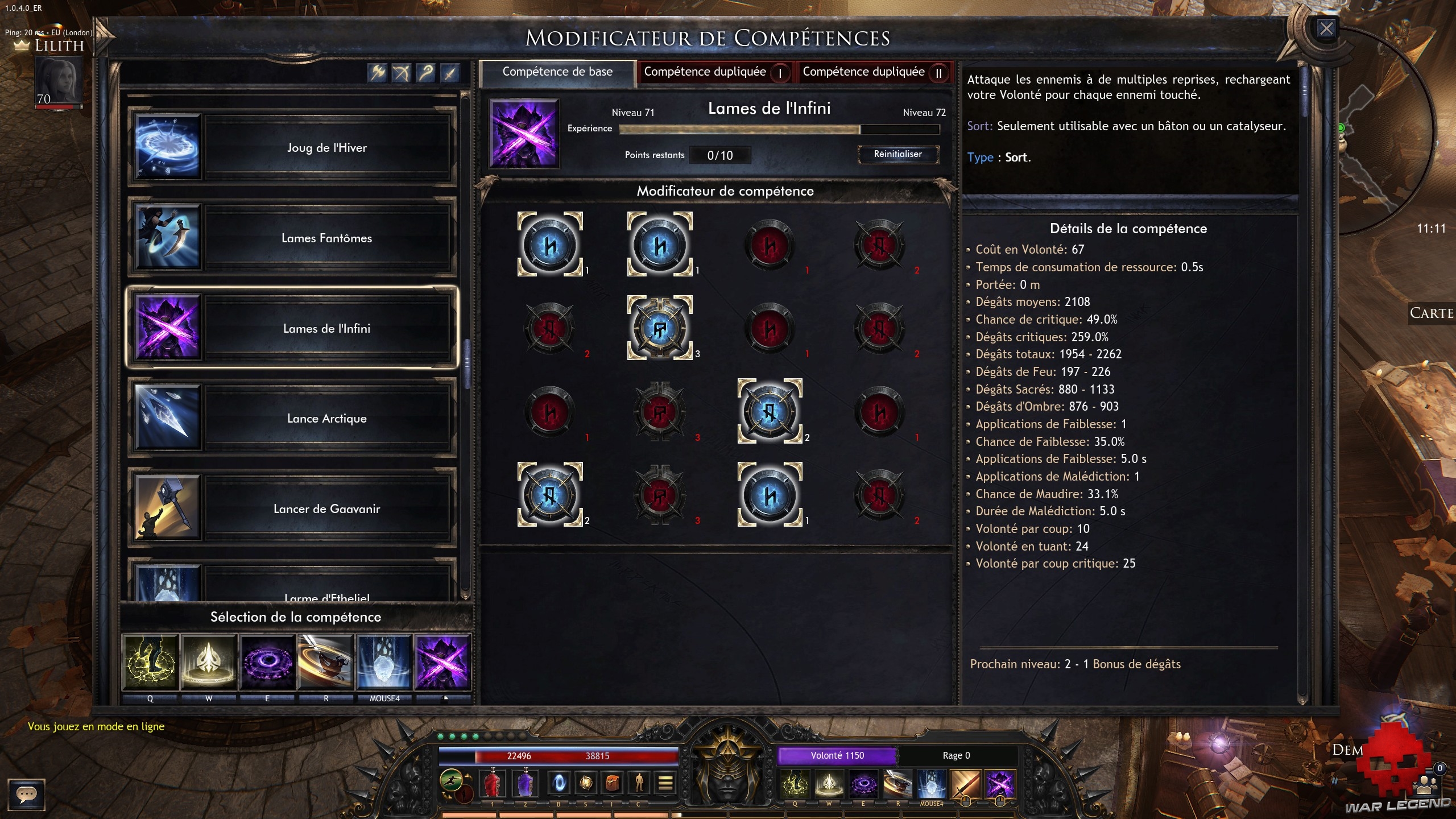 Sauf que la conception d’un build ne s’arrête pas là. Tout comme votre héros, les compétences ont une progression nivelée qui débloque au fur et à mesure des runes — aussi appelé modificateurs. Ces dernières viennent modifier leurs caractéristiques à un degré plus ou moins élevé. Changement d’élément, dégâts augmentés, zone d’effet agrandi… tout un tas de moyens de se créer des versions alternatives d’une attaque donnée. À terme, il est même possible de dupliquer une capacité pour l’équiper plusieurs fois si cela nous chante.