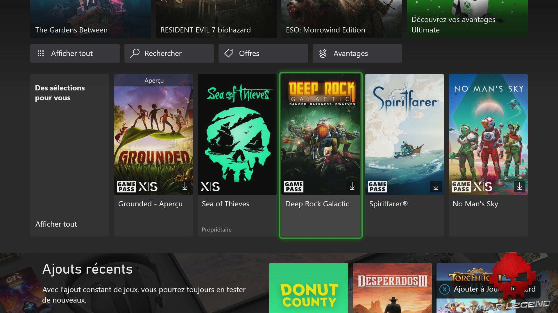 L’onglet qui interpelle tout de suite, c’est bien tendu l’espace réservé pour le Game Pass. Sans surprise, Microsoft aimerait beaucoup que vous soyez abonné à son catalogue à volonté. Ne nous leurrons pas : jouer dans l’équipe verte, c’est adhérer à ce nouveau type de consommation. La Xbox Series X atteint clairement son plein potentiel quand elle accompagnée d’un abonnement Game Pass.