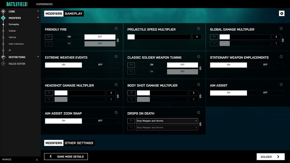Par exemple, en imaginant que l’on veuille une expérience Battlefield à l’ancienne, il sera possible de désactiver la régénération de vie automatique des joueurs, voire la possibilité de glisser. En associant une restriction des armes et des véhicules (ayant eux-mêmes leurs propres modificateurs) venant des jeux cités plus haut, toutes les folies sont permises.