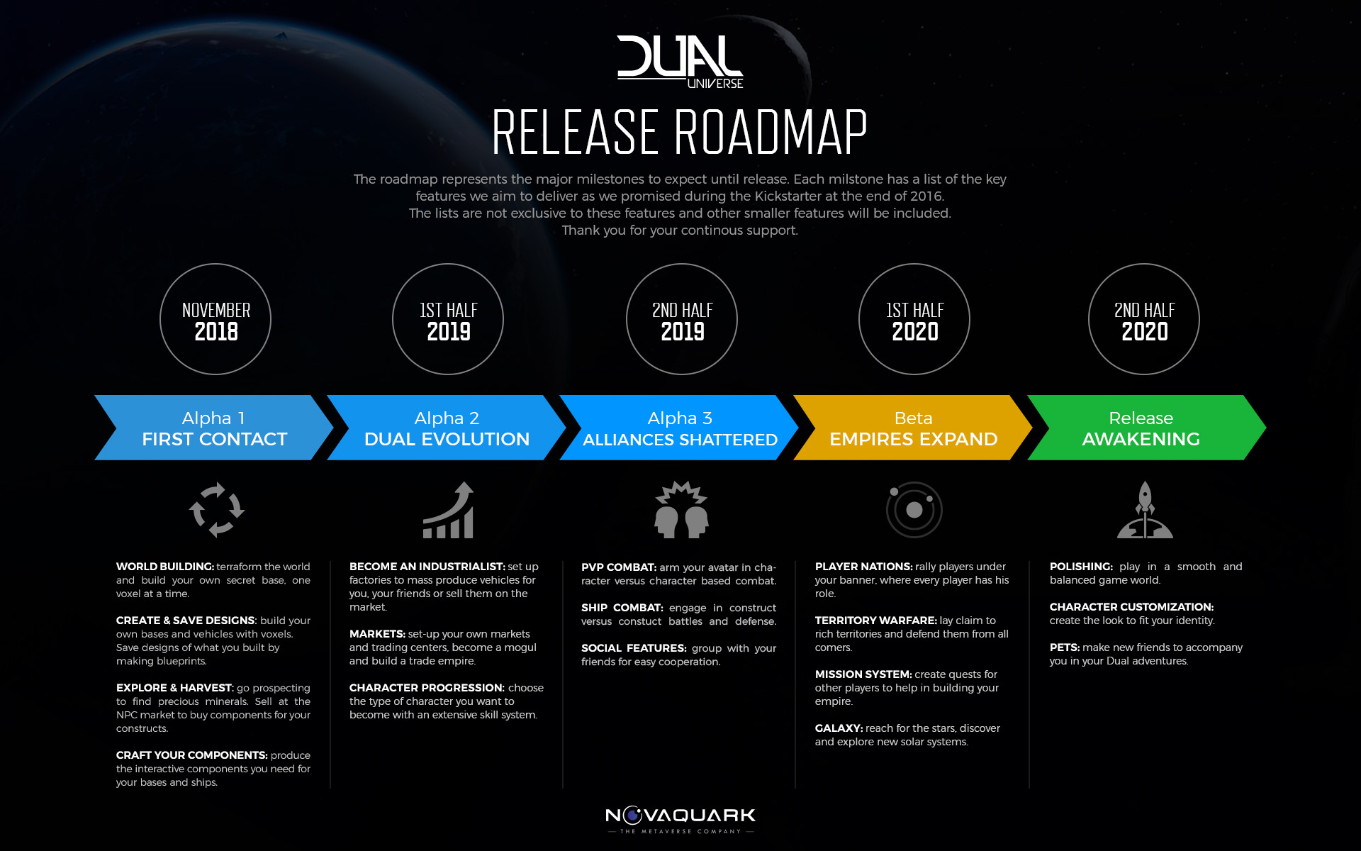 Cette nouvelle version du sandbox augmente la surface de la terre ferme sur la planète de départ afin de permettre de donner aux joueurs plus d’espace de liberté pour laisser exprimer leur créativité. D’ailleurs, la majorité des choses montrées dans la vidéo sont des créations des joueurs actuels de Dual Universe.