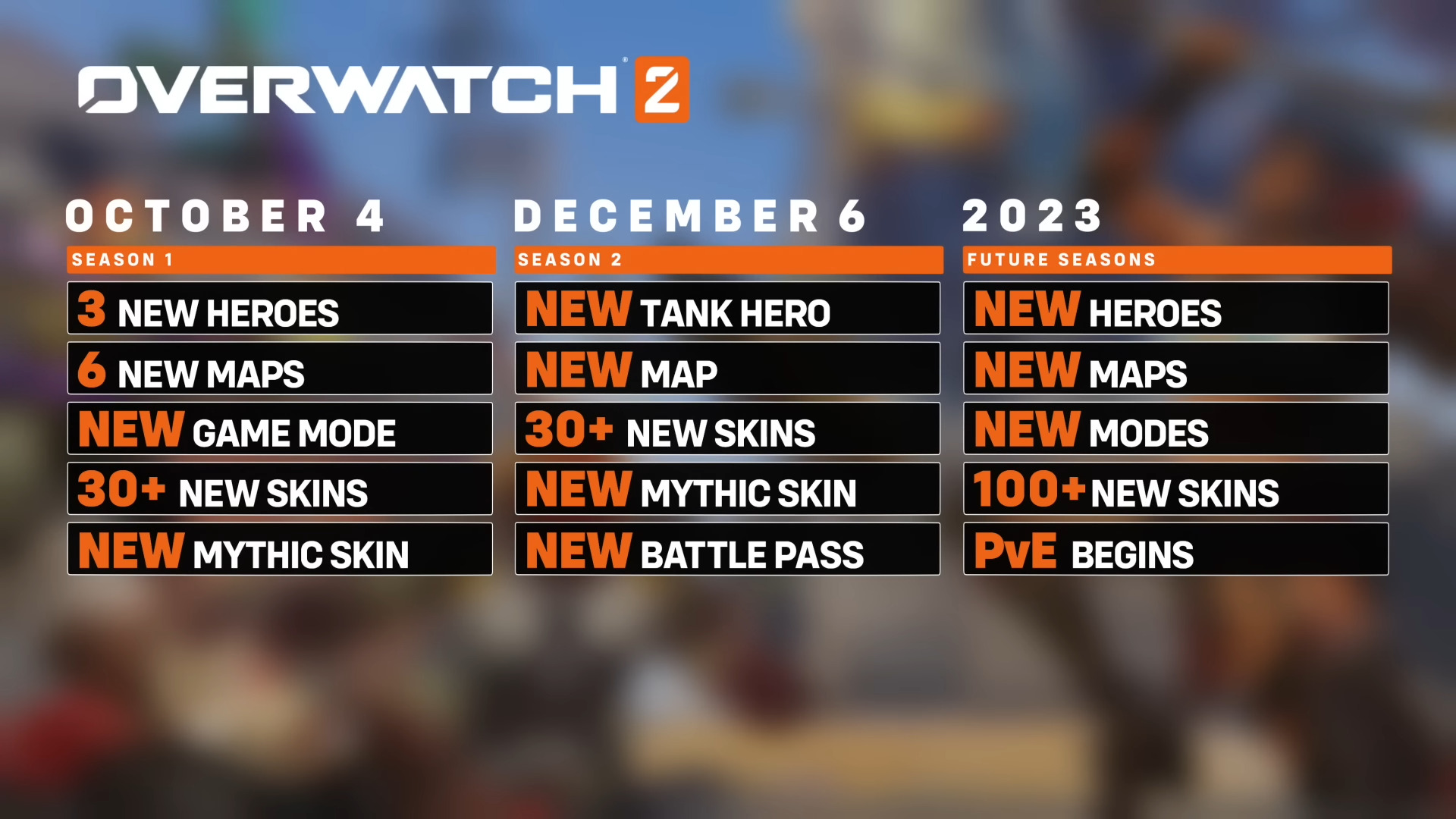Le 4 octobre, en comprenant Sojourn et Junker Queen, Overwatch accueillera donc 3 nouveaux héros et 6 nouvelles cartes dont certaines sont taillées pour le nouveau mode Push. Les saisons devraient durer 2 mois, avec la seconde saison qui apportera un nouveau tank et une nouvelle carte. Blizzard n’a pas dit si ce rythme de déploiement de nouveau contenu sera respecté, mais de nouveaux héros et nouvelles cartes sont bel et bien prévus pour le courant de l’année 2023.