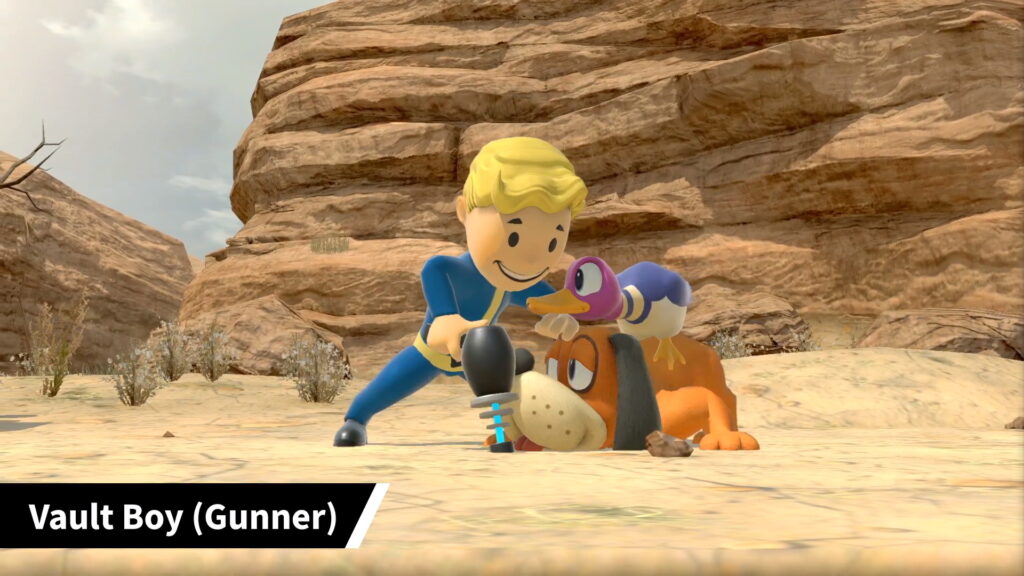 Dans un deuxième temps, Sakurai annonce les prochains costumes Mii à rejoindre la liste des « persos rejetés ». Je ne sais ce qu’il y avait de plus surprenant dans ce stream : voir une PlayStation 4 dans une vidéo officielle Nintendo, ou le fait que Vault Boy soit intégré au jeu d’une façon ou d’une autre. En effet, on retrouve la mascotte de Fallout aux côté de Ninjara de ARMS, Ayo et Oly de Splatoon, ainsi que Heihachi de Tekken (une licence qui mériterait une vraie présence dans le jeu, mine de rien).