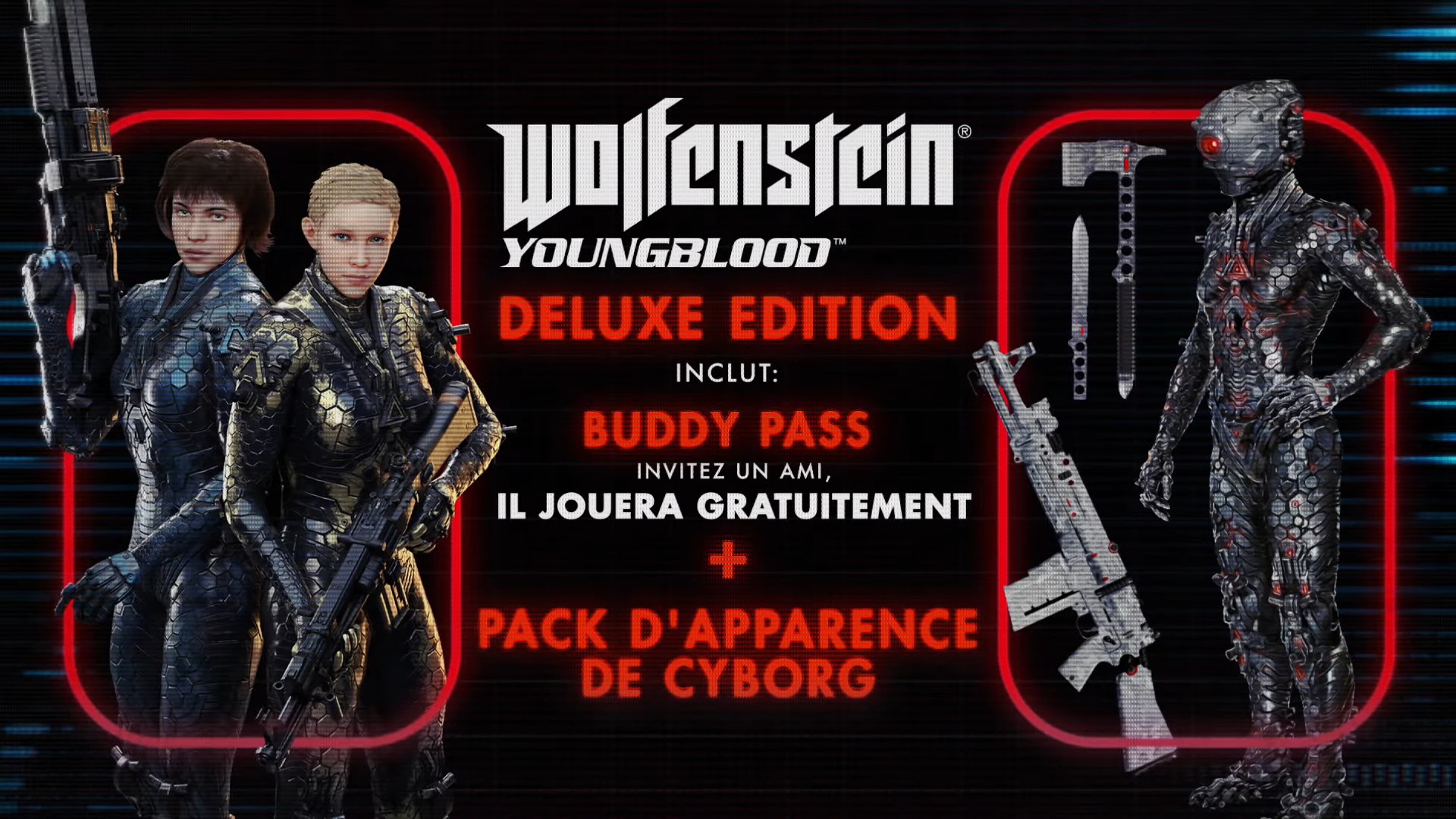 Si vous avez un pote prêt à vous suivre dans une bonne grosse tuerie de soldats de la Wehrmacht, l’édition Deluxe de Wolfenstein: Youngblood vous procura un Buddy Pass qui permettra à quelqu’un de télécharger gratuitement le jeu de son côté, afin de vous rejoindre dans votre partie, à la manière de A Way Out. Vous obtiendrez également des skins exclusifs, idem si vous précommandez le jeu.