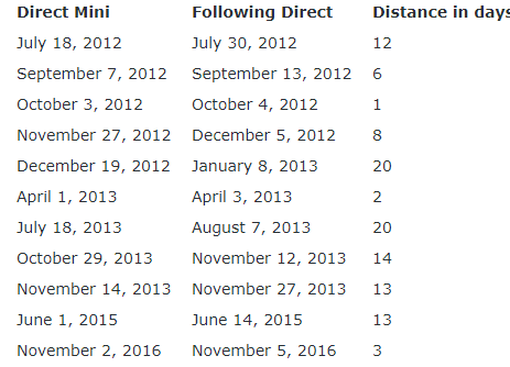 Si on se penche sur les dates des Nintendo Direct mini, on se rend vite compte qu’ils ont été suivis de près systématiquement par de vrais Nintendo Direct touffus, dans la quinzaine de jours qui ont suivi, et pas seulement à 2 ou 3 reprises.
