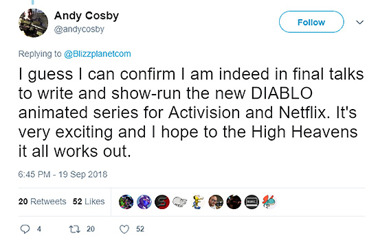 Je suppose que je peux confirmer que je suis effectivement en train d’écrire et de présenter les nouvelles séries animées Diablo pour Activision et Netflix. C’est très excitant et je prie les Hauts Cieux que tout aille bien.