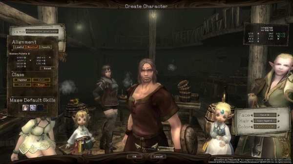 Parlons d’abord de la création de votre personnage. Nous avons le choix des races suivantes : humains, elfes, nains (mâle uniquement), gnomes (femelle uniquement) et porkul ainsi que les classes guerrier, mage, prêtre et voleur.
